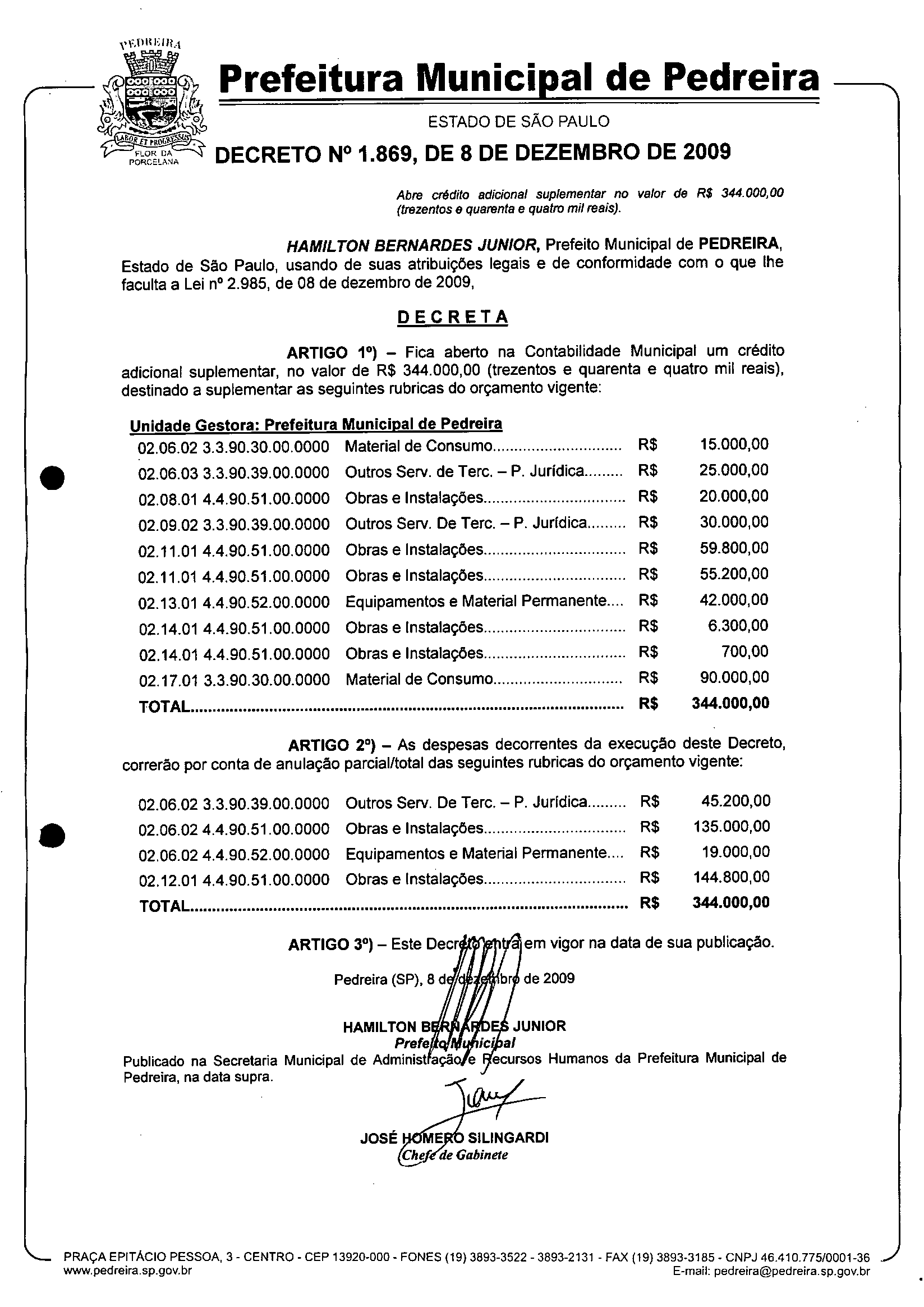Ementa: Abre crédito adicional suplementar no valor de R$ 344.000,00 (trezentos e quarenta e quatro mil reais).