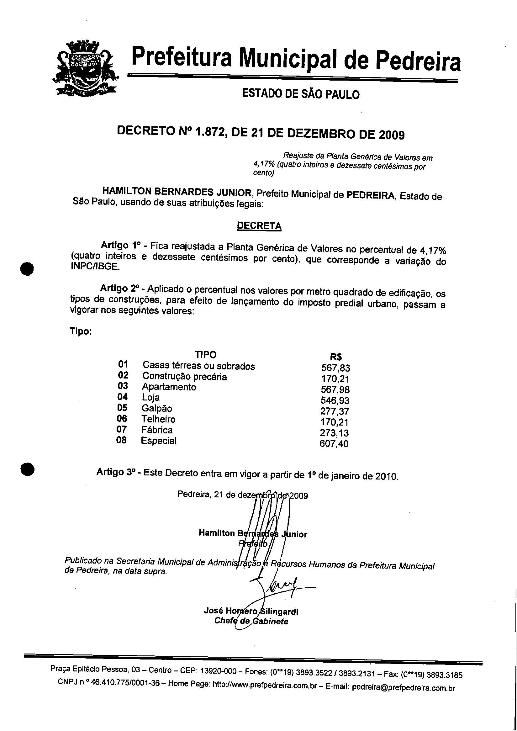 Ementa: Reajuste da Planta Genérica de Valores em 4,17% (quatro inteiros e dezessete centésimos por cento).