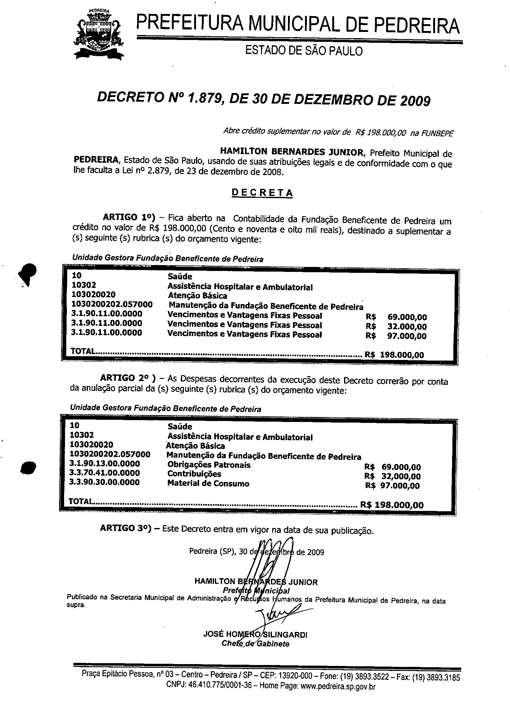 Ementa: Abre crédito suplementar no valor de R$ 198,000,00 na FUNBEPE