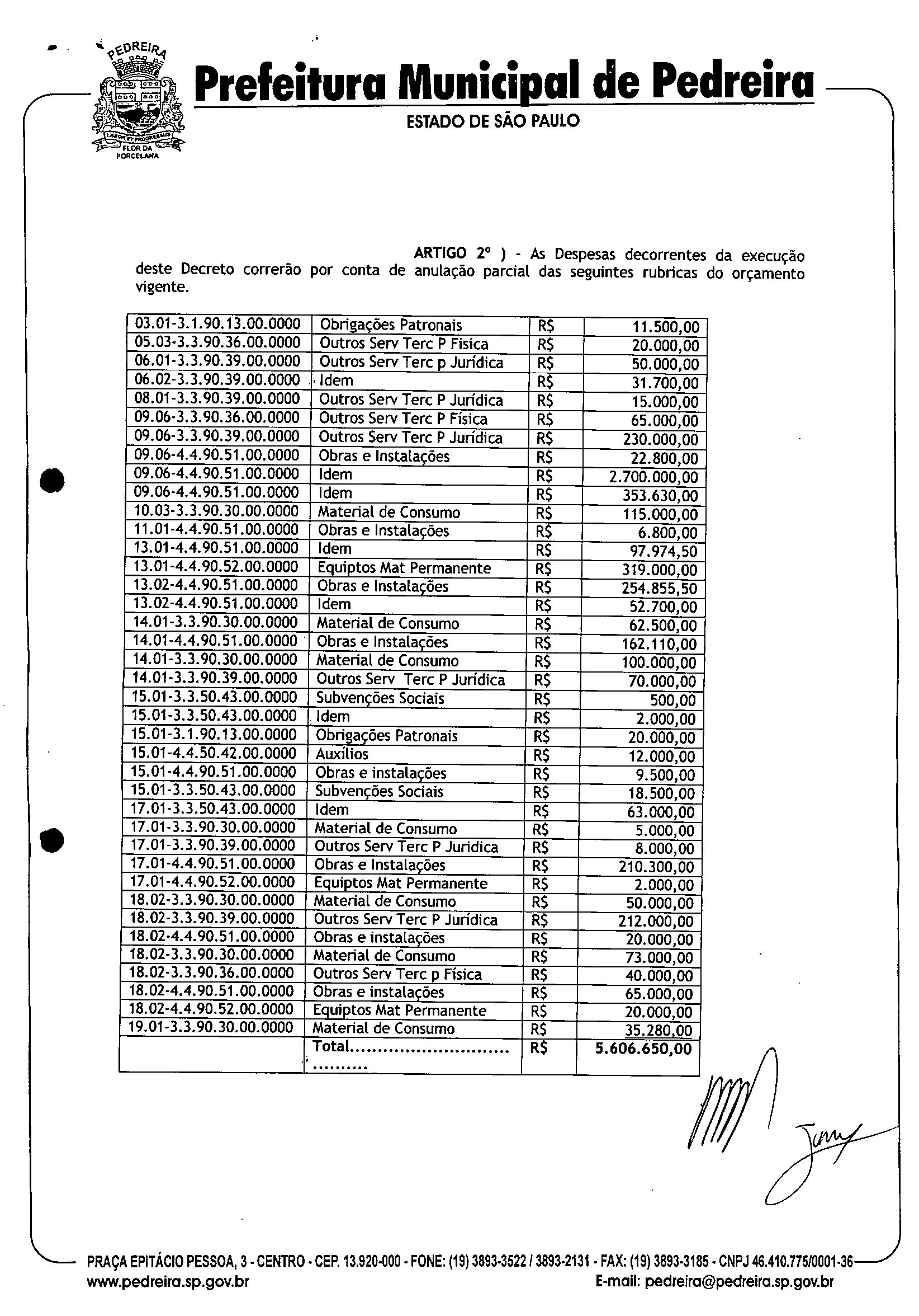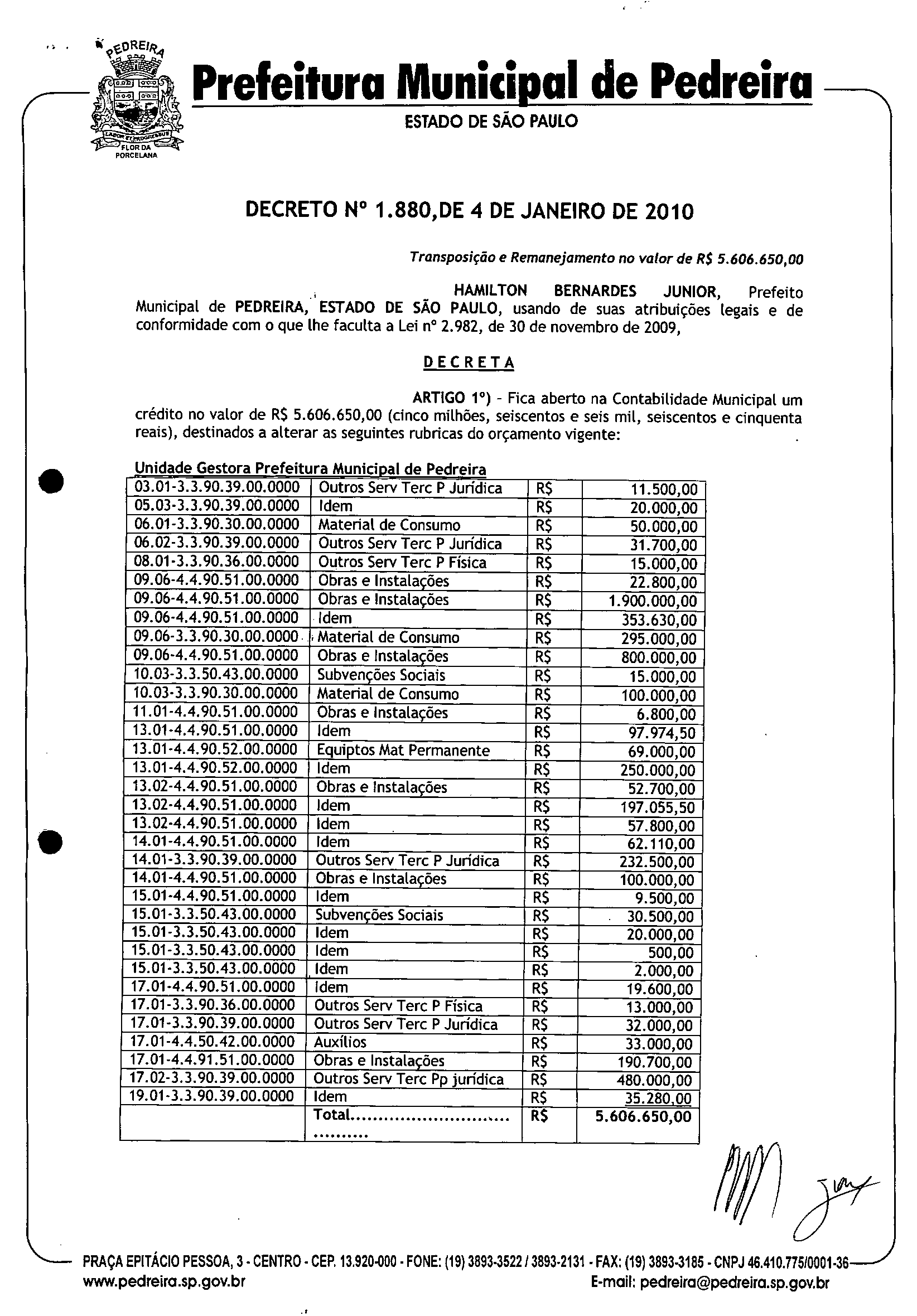 Ementa: Transposição e Remanejamento no valor de R$ 5.606.650,00
