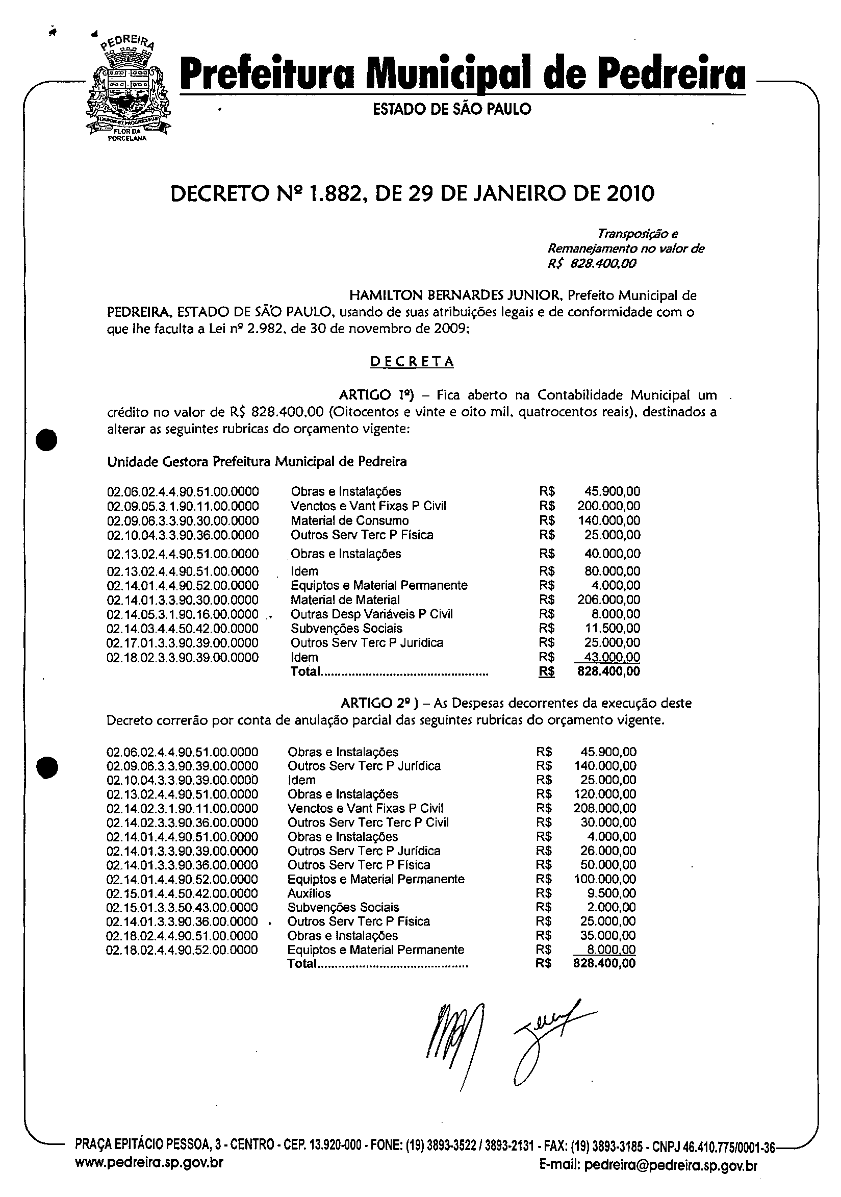 Ementa: Transposição e Remanejamento no valor de R$ 828.400.00