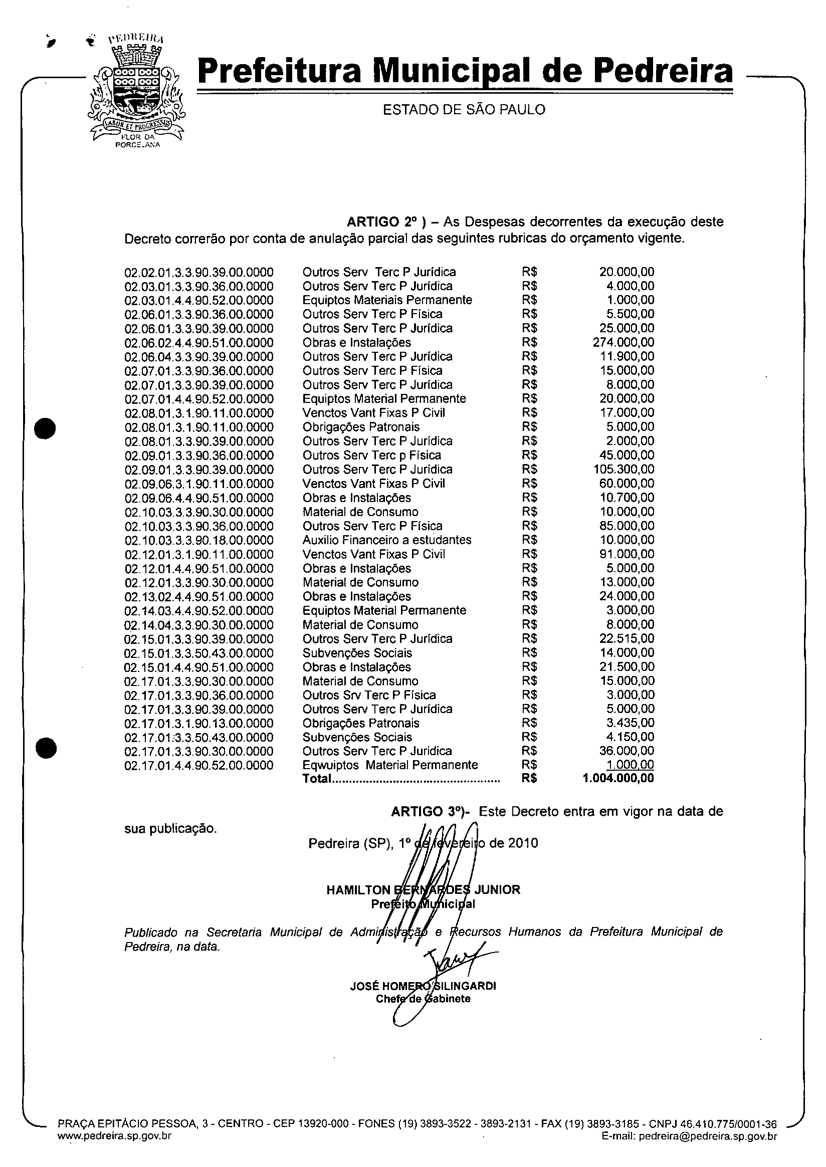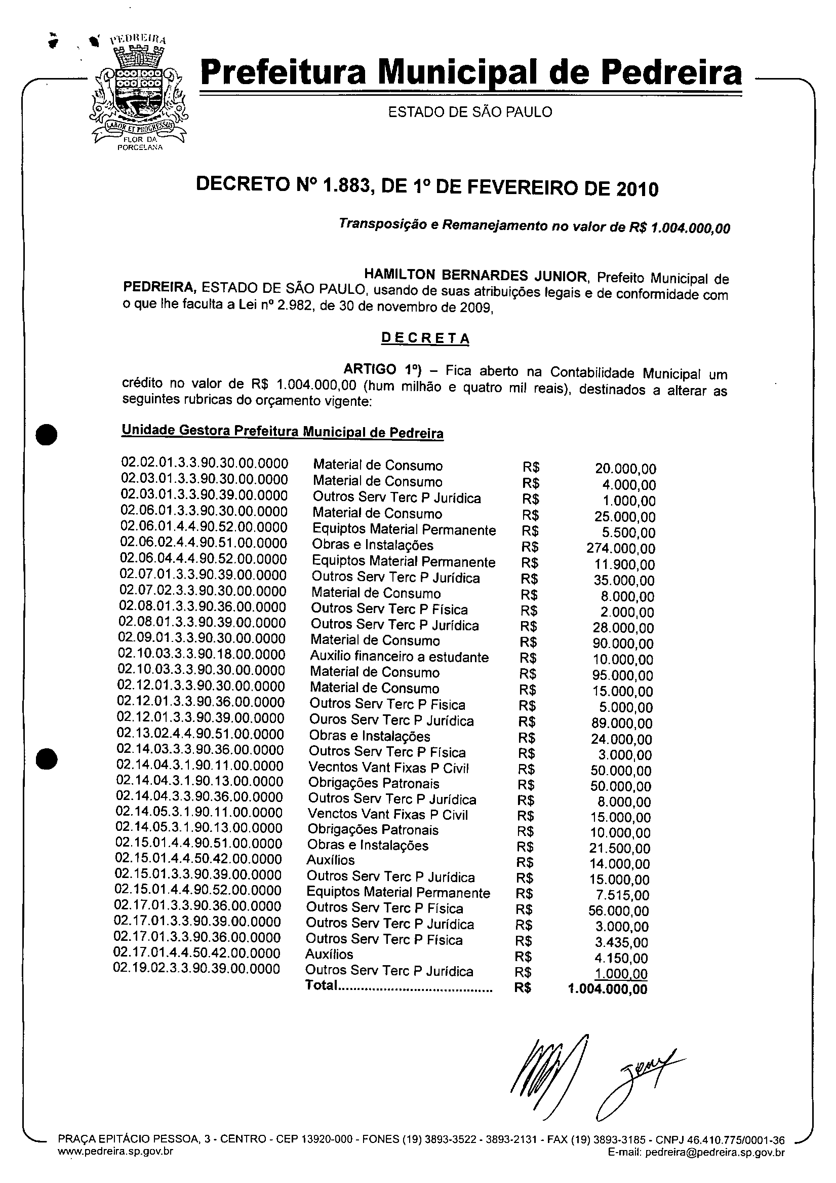 Ementa: Transposição e Remanejamento no valor de R$1.004.000,00