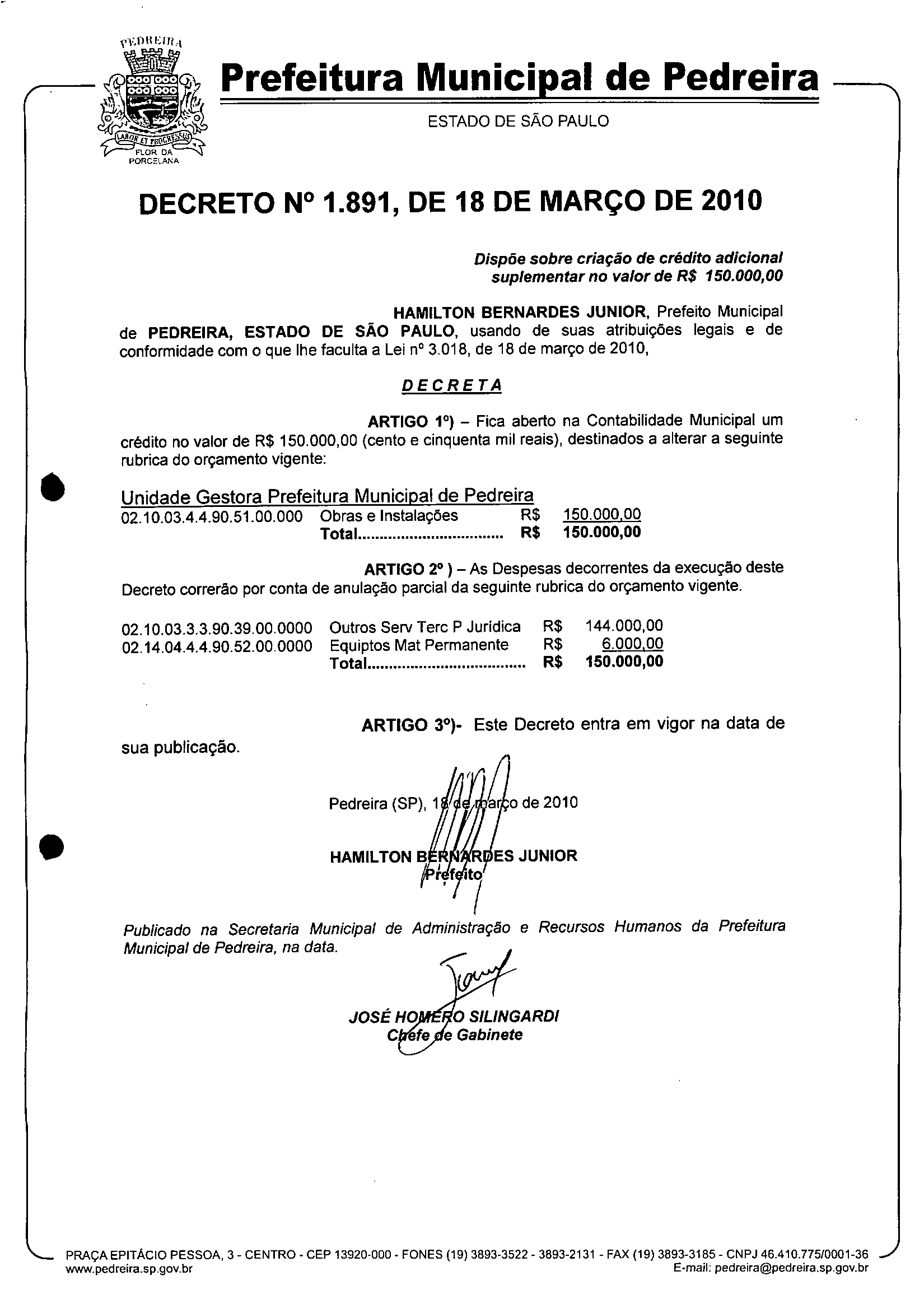 Ementa: Dispõe sobre criação de crédito adicional suplementar no valor de R$ 150.000,00
