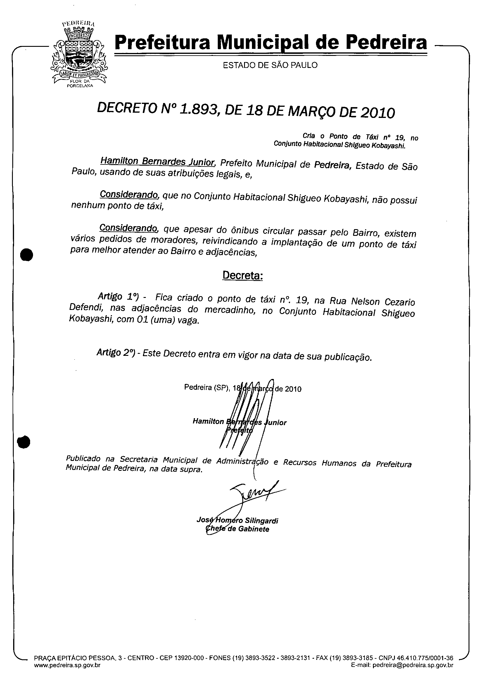 Ementa: Cria o Ponto de Táxi n°19, no Conjunto Habitacional Shigueo Kobayashi.