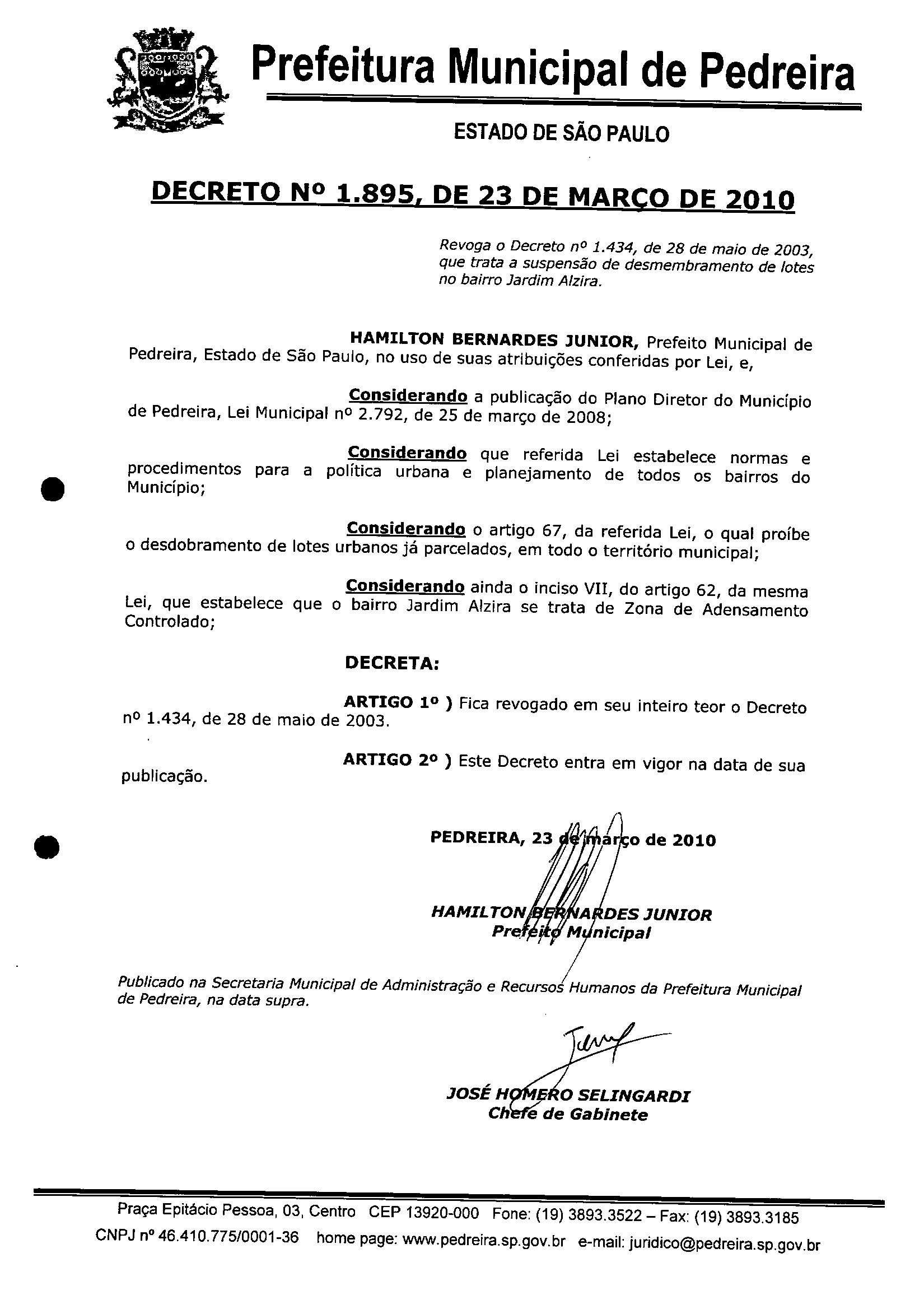 Ementa: Revoga o Decreto nº 1.434, de 28 de maio de 2003, que trata a suspensão de desmembramento de lotes no bairro Jardim Alzira.