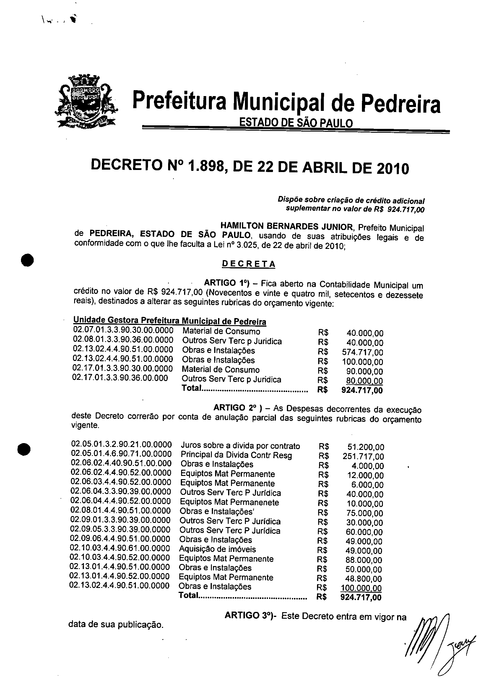 Ementa: Dispõe sobre criação de crédito adicional suplementar no valor de R$ 924.717,00