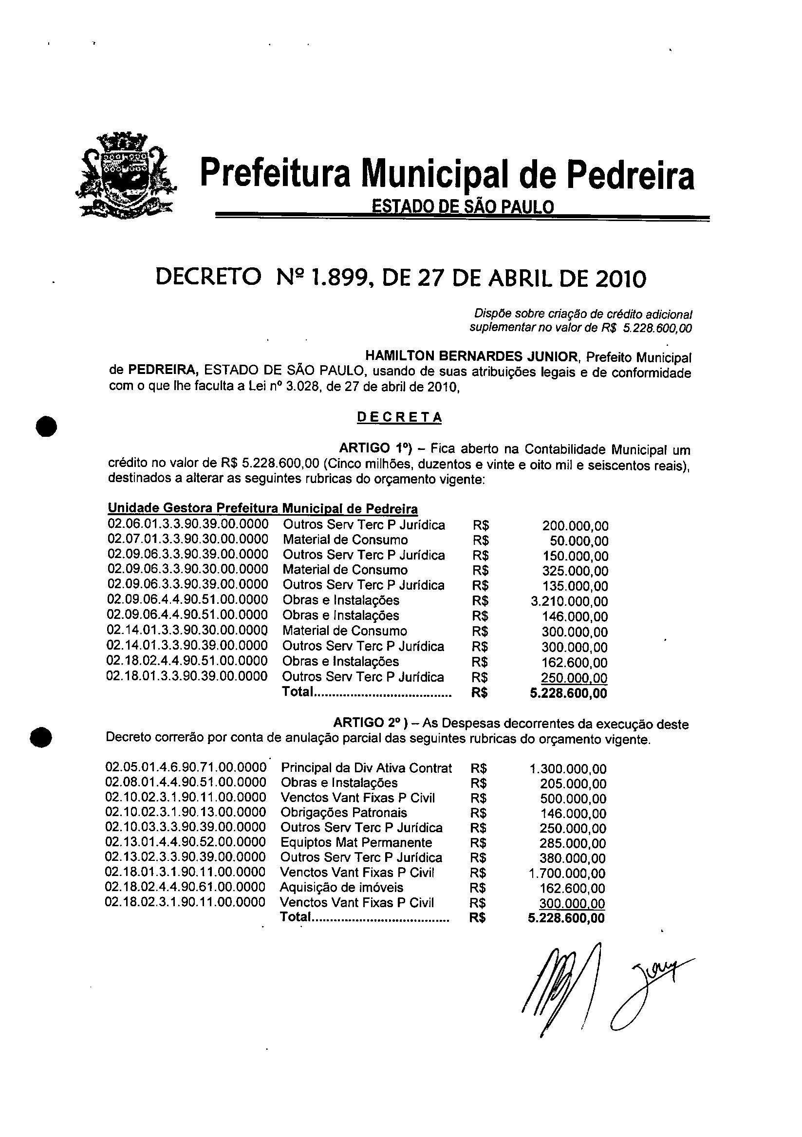 Ementa: Dispõe sobre criação de crédito adicional suplementar no valor de R$ 5.228.600,00
