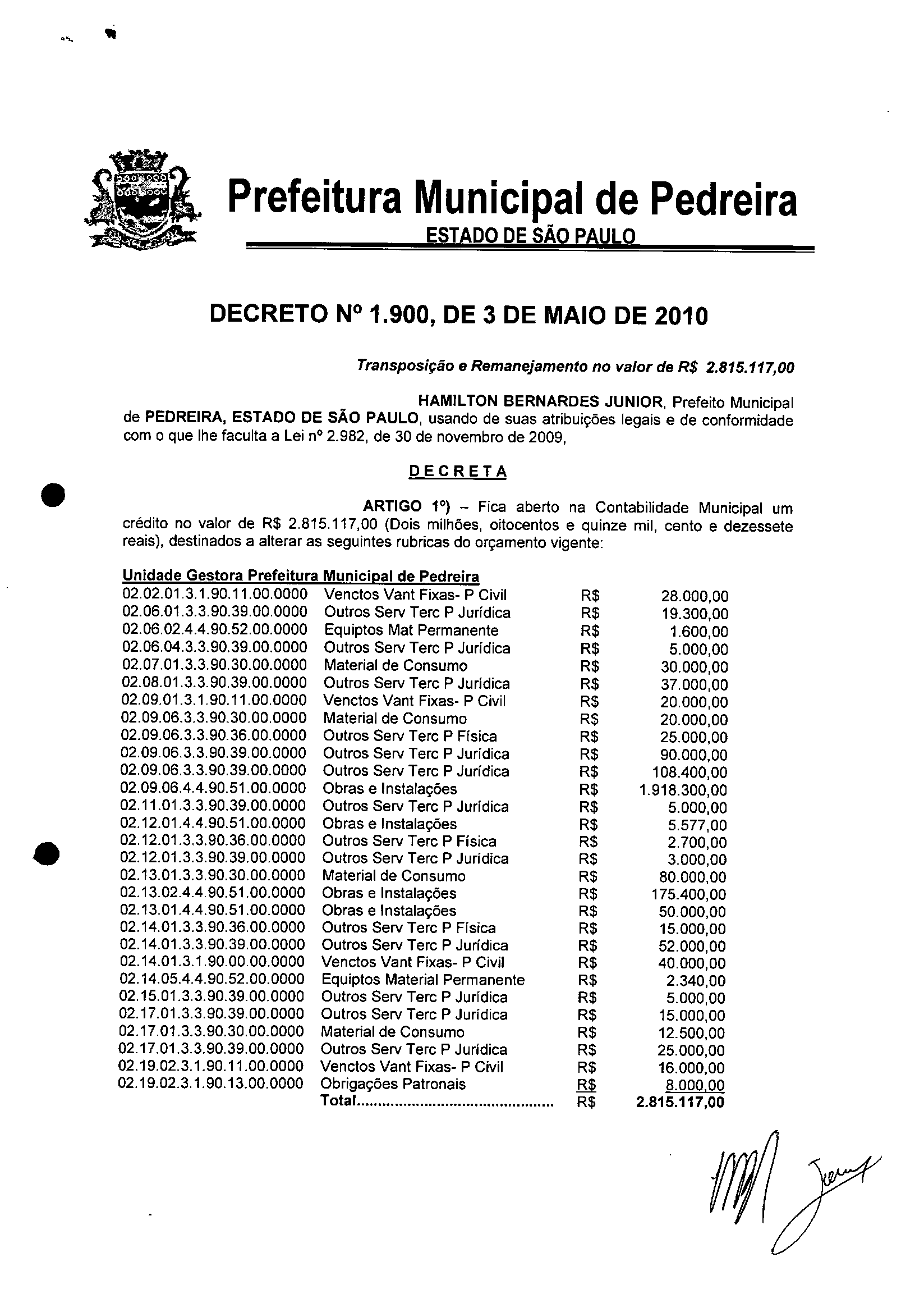 Ementa: Transposição e Remanejamento no valor de R$ 2.815.117,00