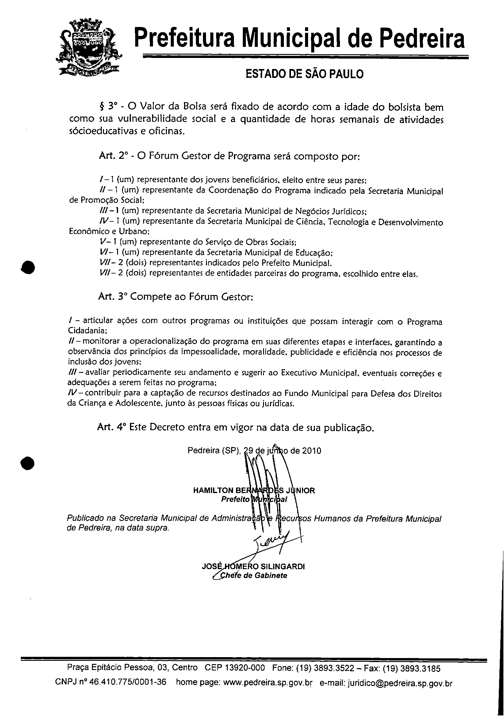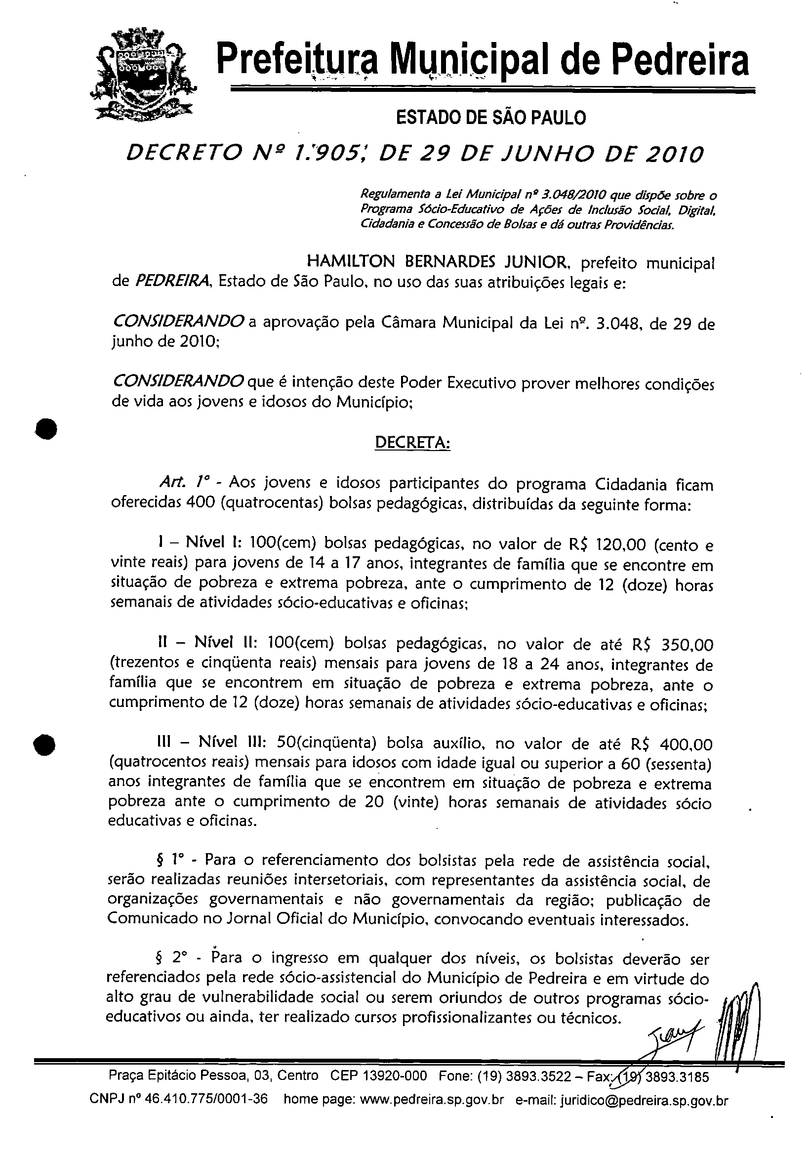 Ementa: Regulamenta a lei Municipal nº 3.048/2010 que dispõe sobre o Programa Sócio-Educativo de Ações de Inclusão Social, Digital, Cidadania e Concessão de BoIsas e dá outras Providências.