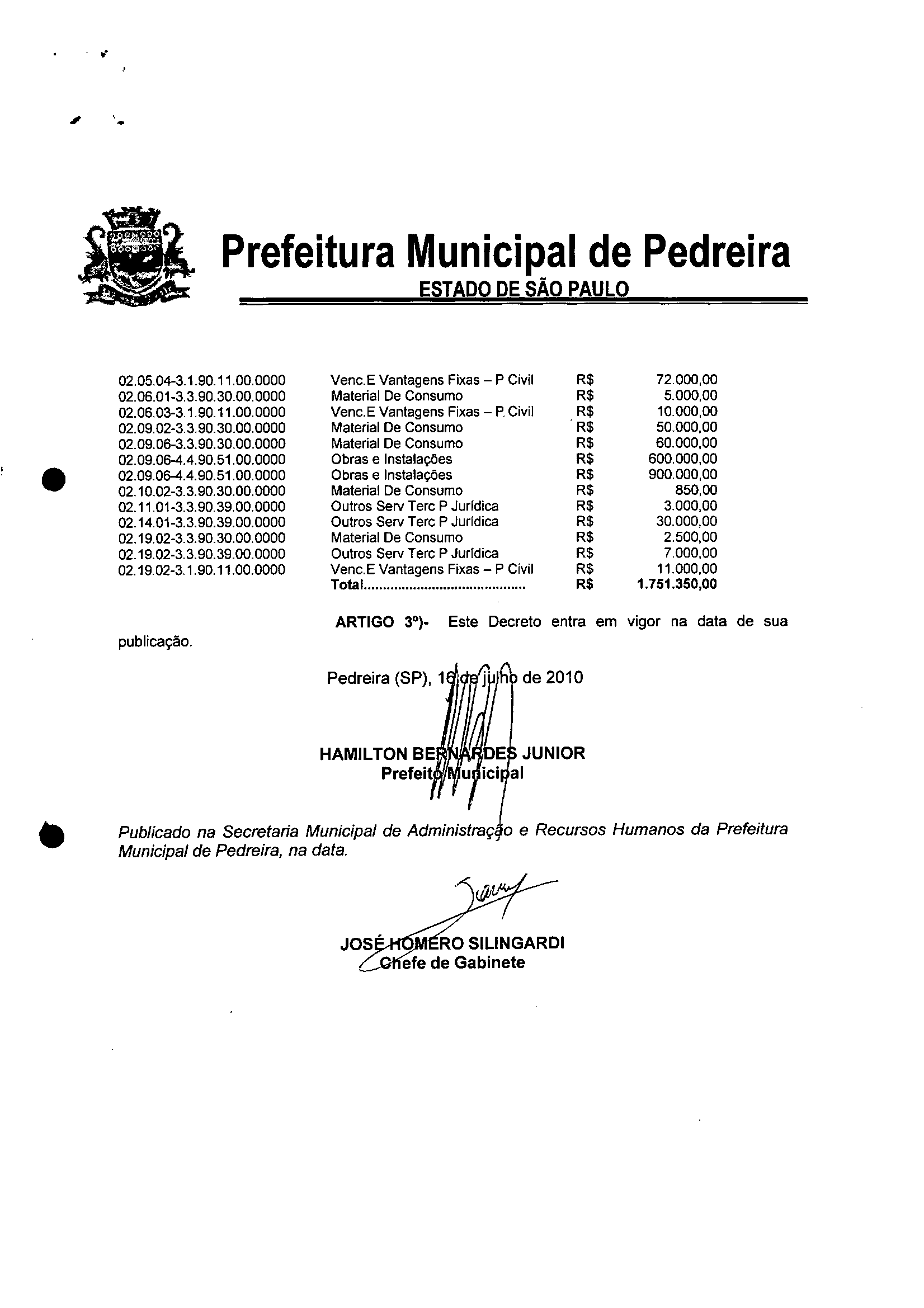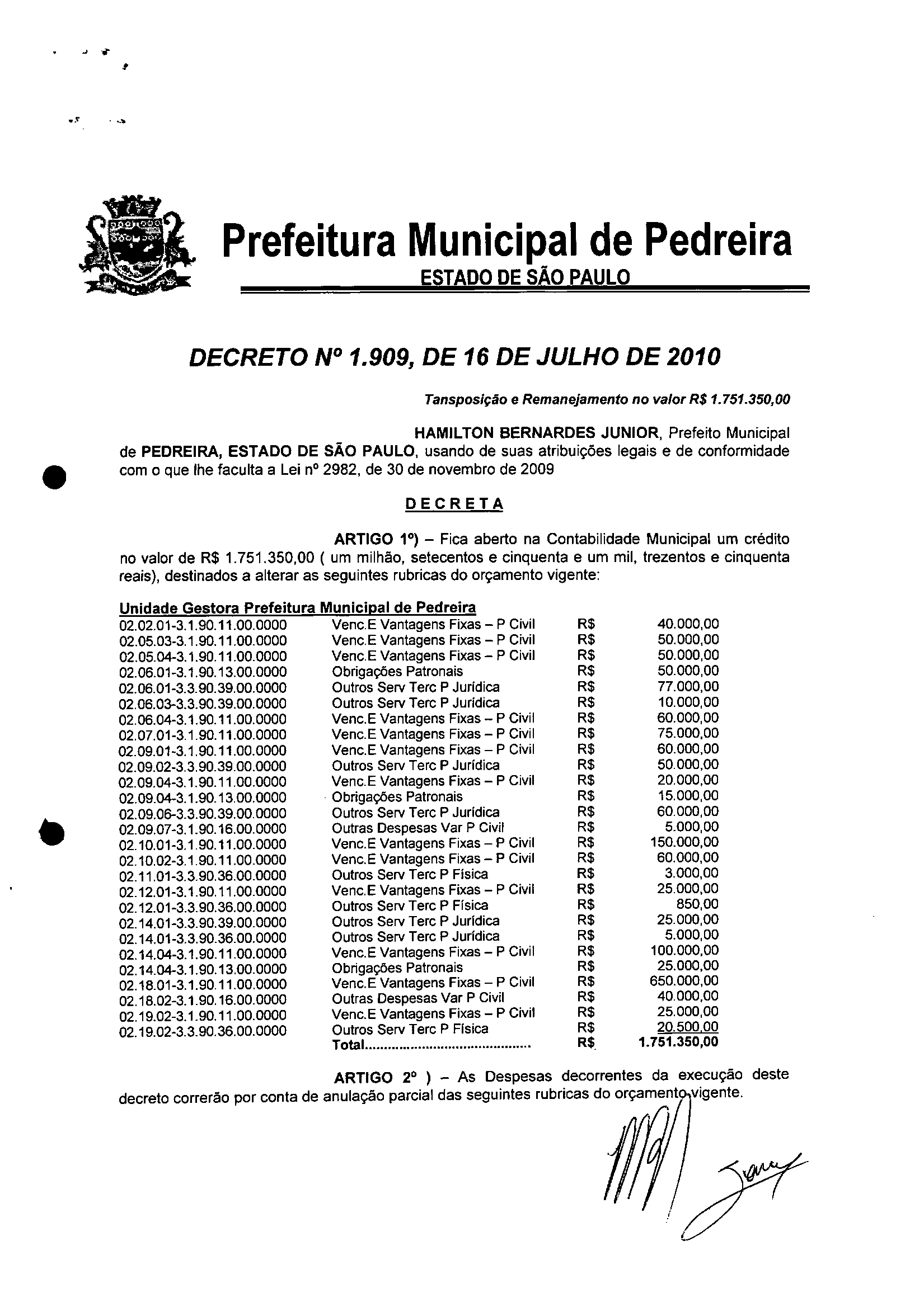 Ementa: Tansposição e Remanejamento no valor R$1.751.350,00