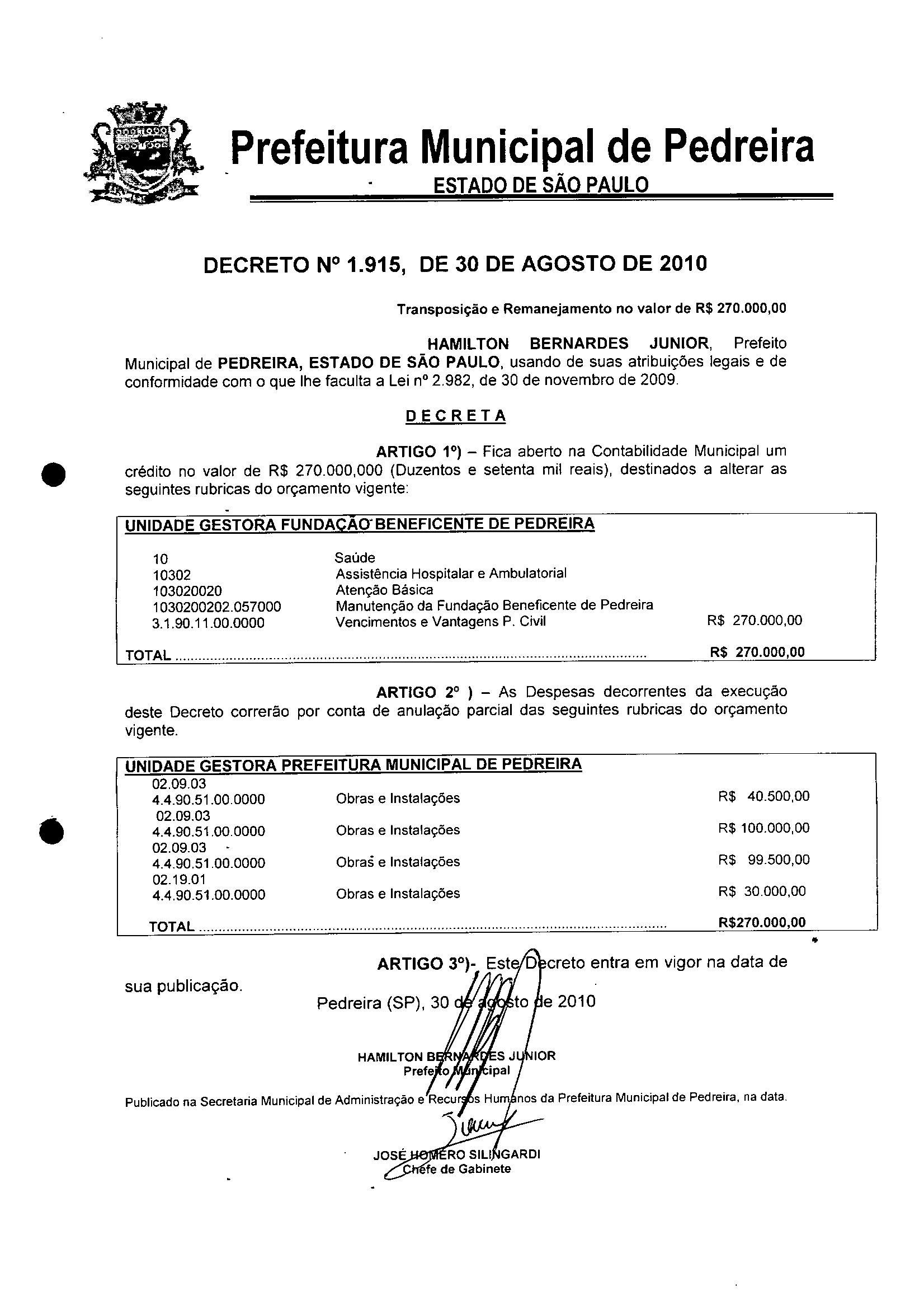 Ementa: Transposição e Remanejamento no valor de R$ 270.000,00