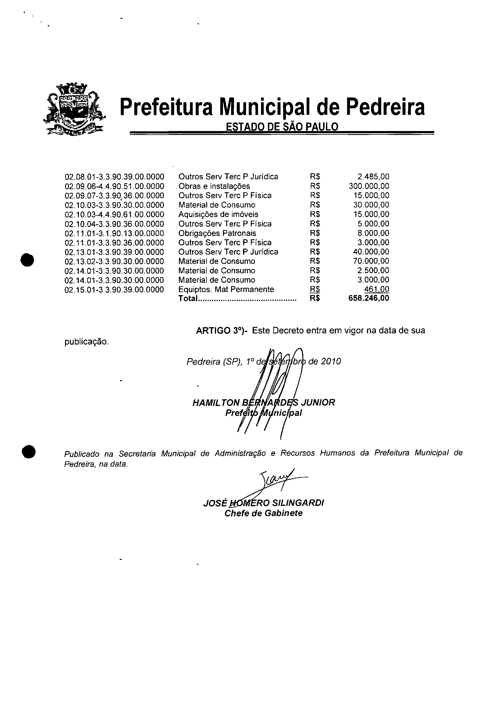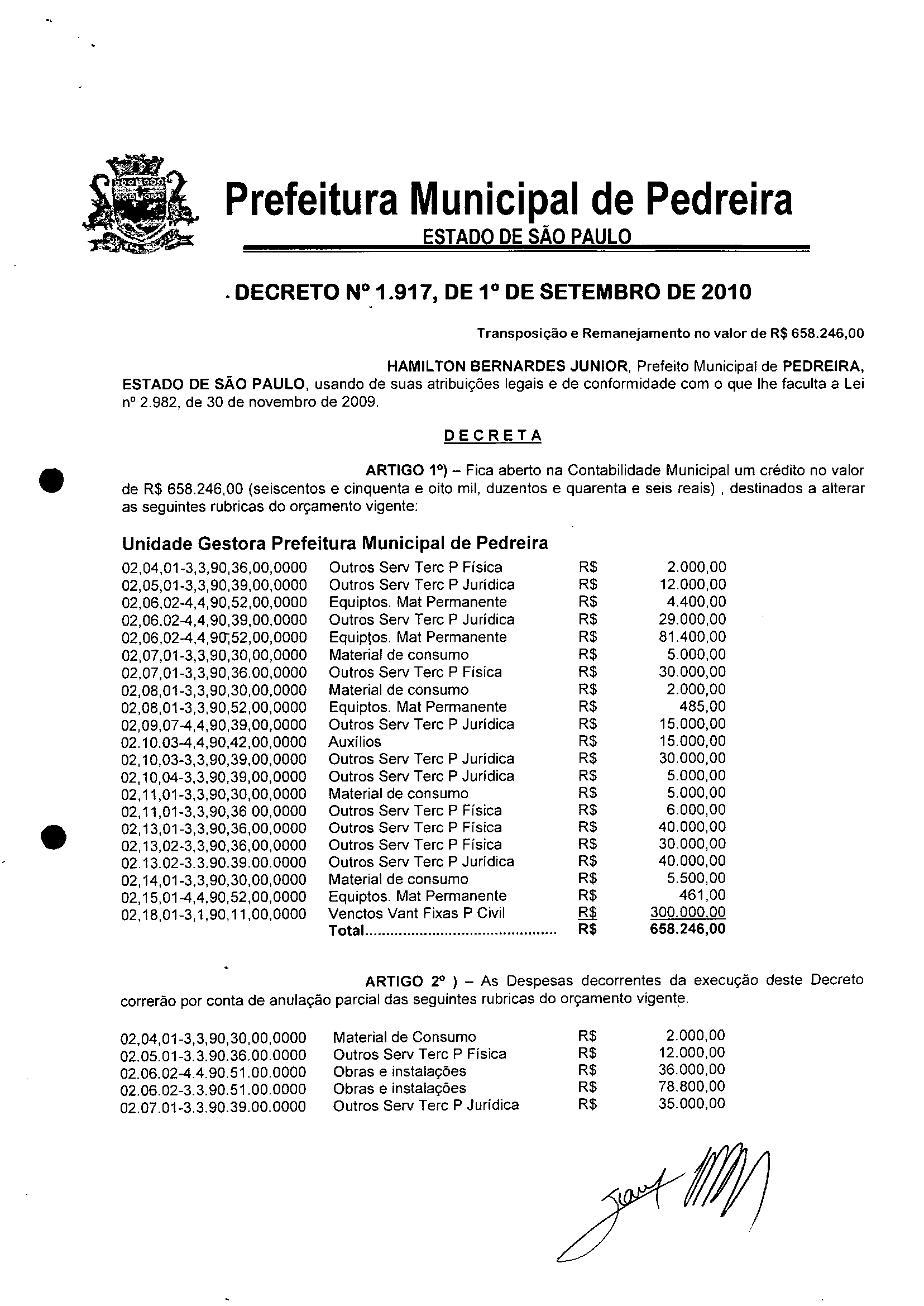 Ementa: Transposição e Remanejamento no valor de R$ 658.246,00
