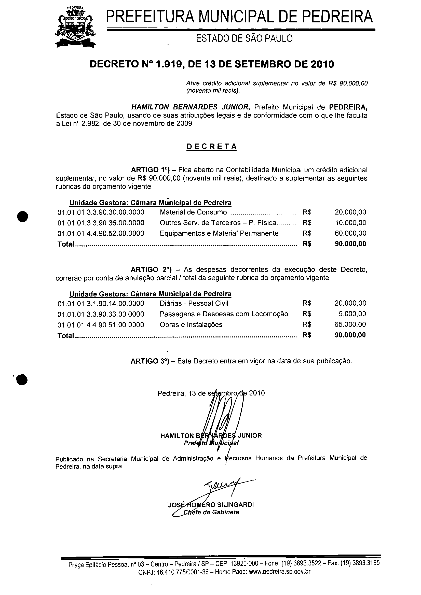 Ementa: Abre crédito adicional suplementar no valor de R$ 90.000,00 (noventa mil reais).