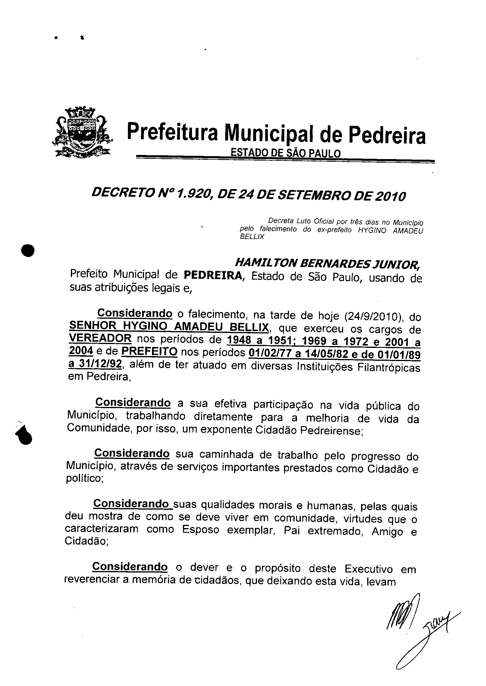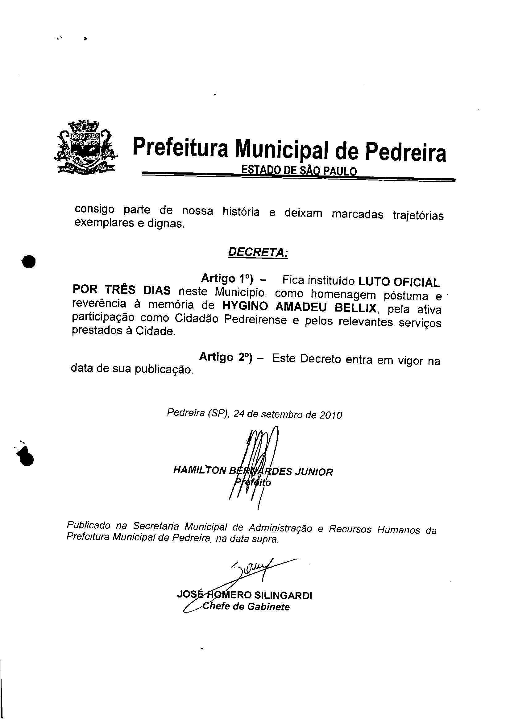 Ementa: Decreta Luto Oficial por três dias no Município pelo falecimento do ex-prefeito HYGINO AMADEU BELLlX
