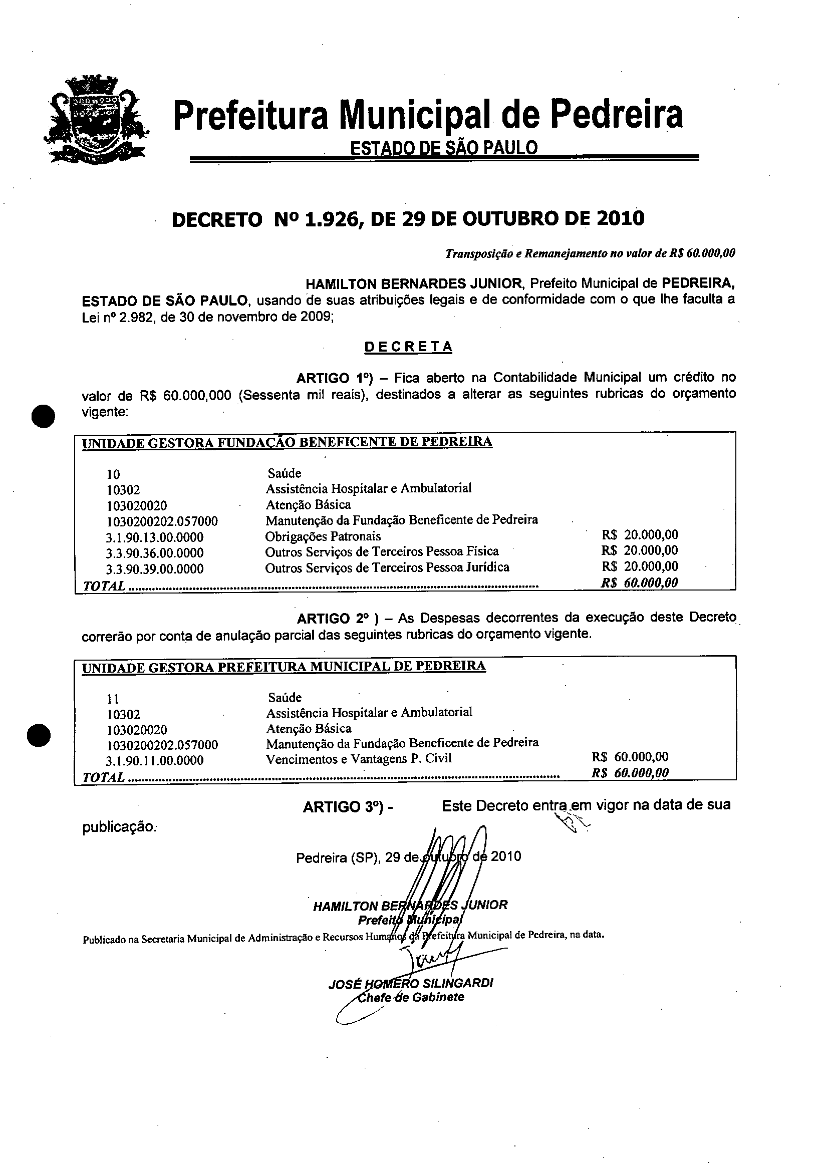Ementa: Transposição e Remanejamento no valor de R$ 60.000,00
