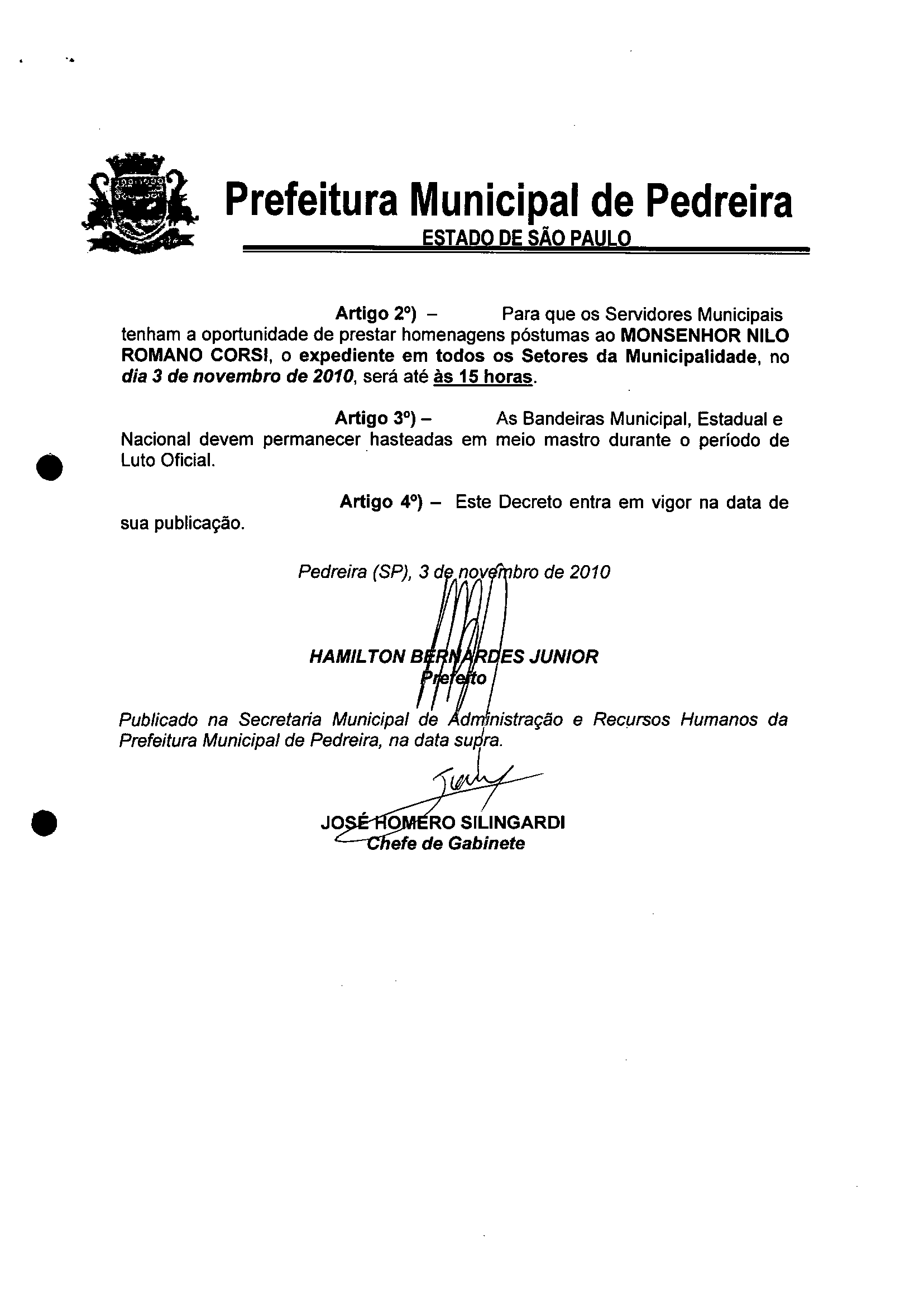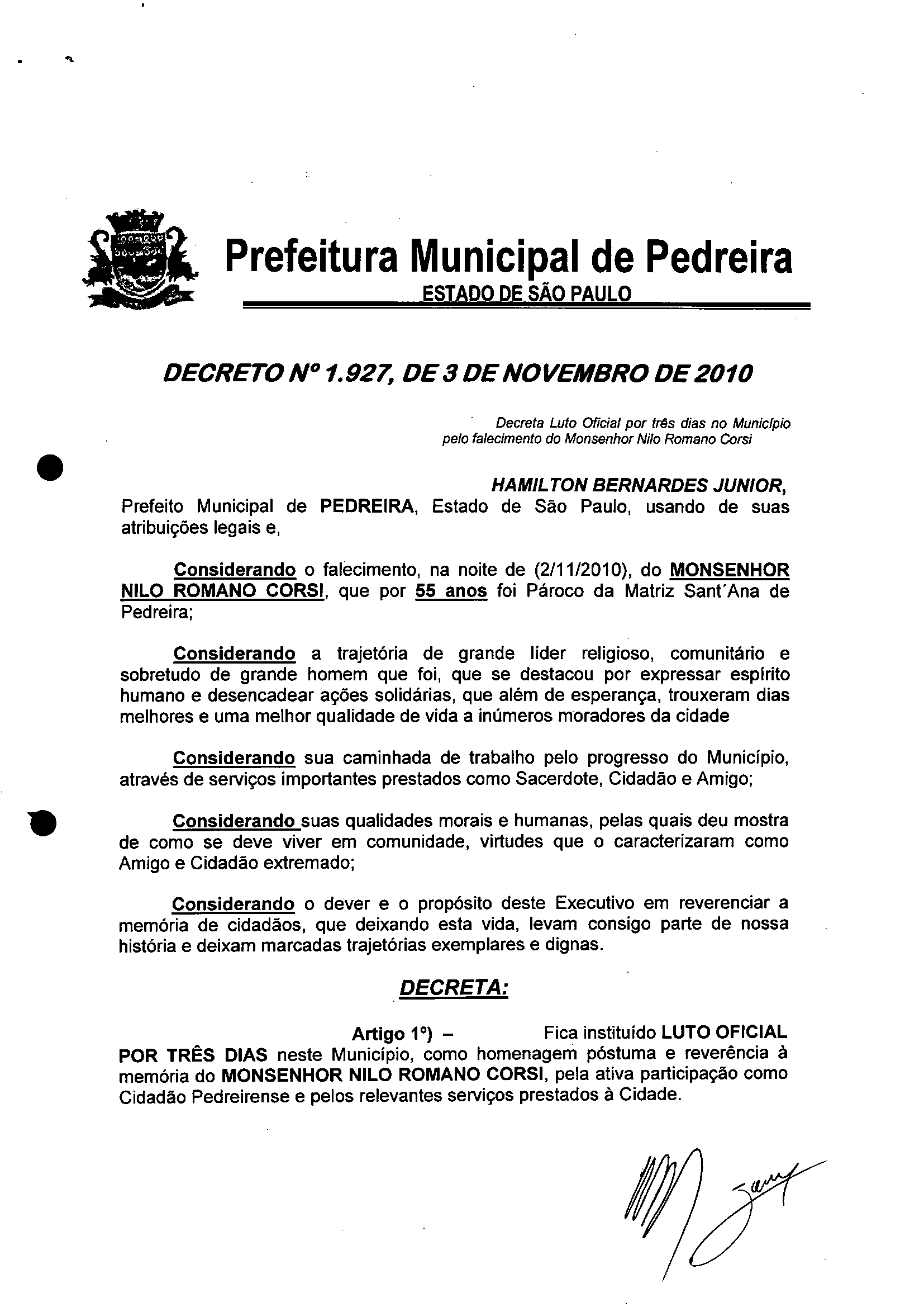 Ementa: Decreta Luto Oficial por tres dias no Municipio pelo falecimento do Monsenhor Nilo Romano Corsi