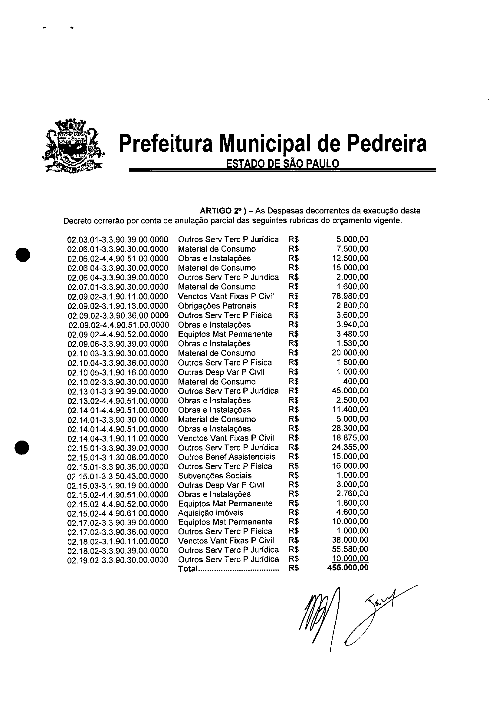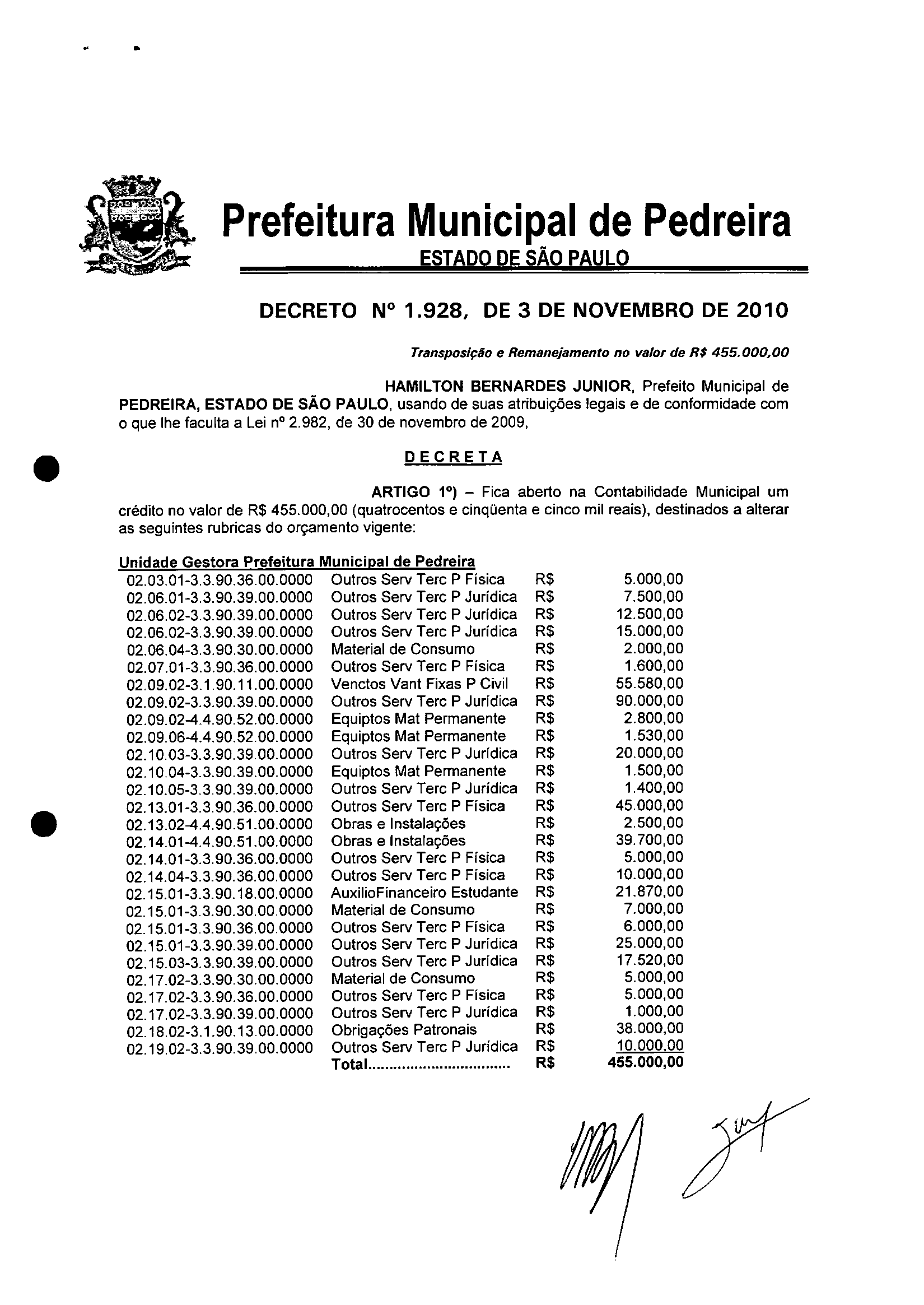 Ementa: Transposição e Remanejamento no valor de R$ 455.000,00