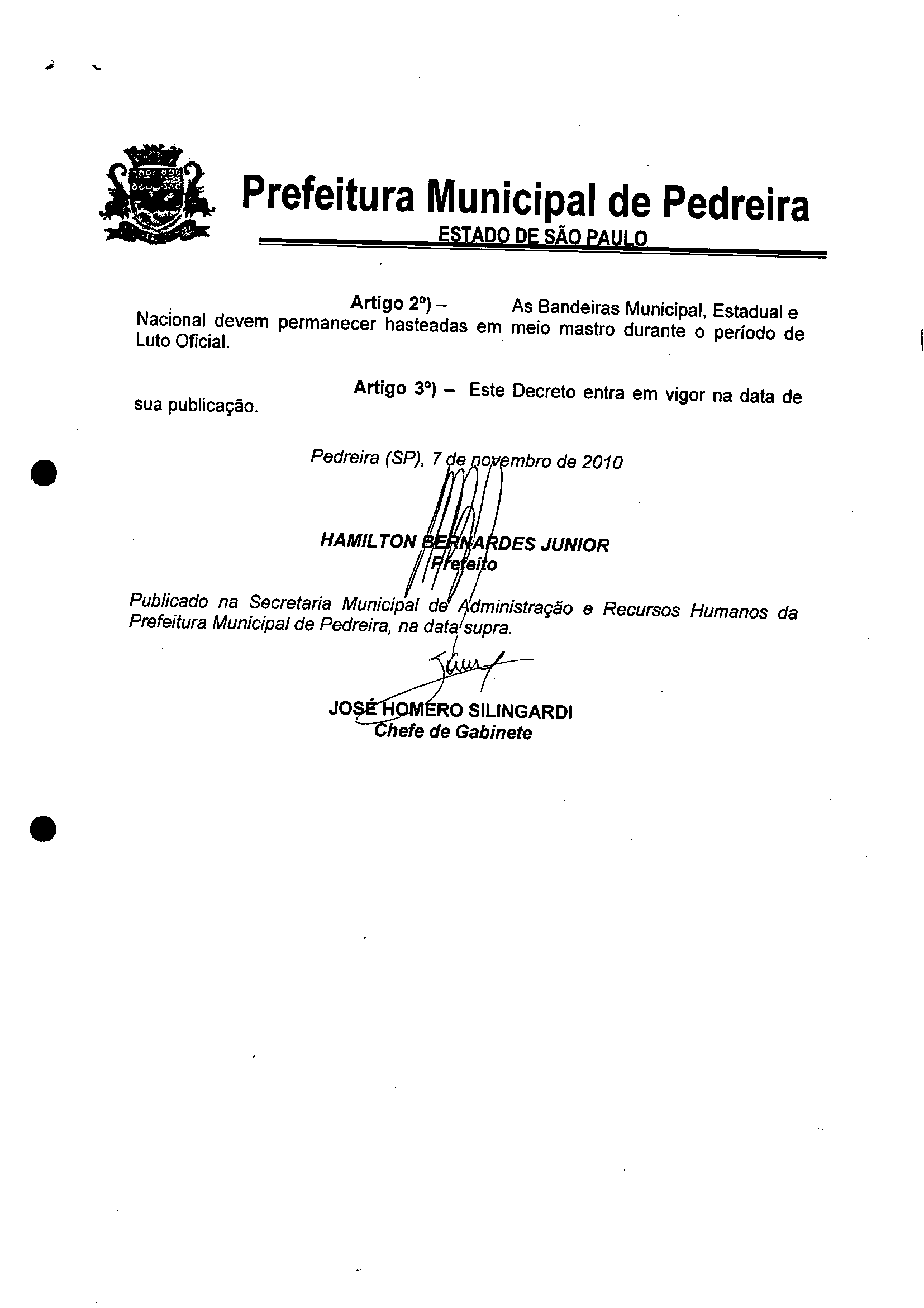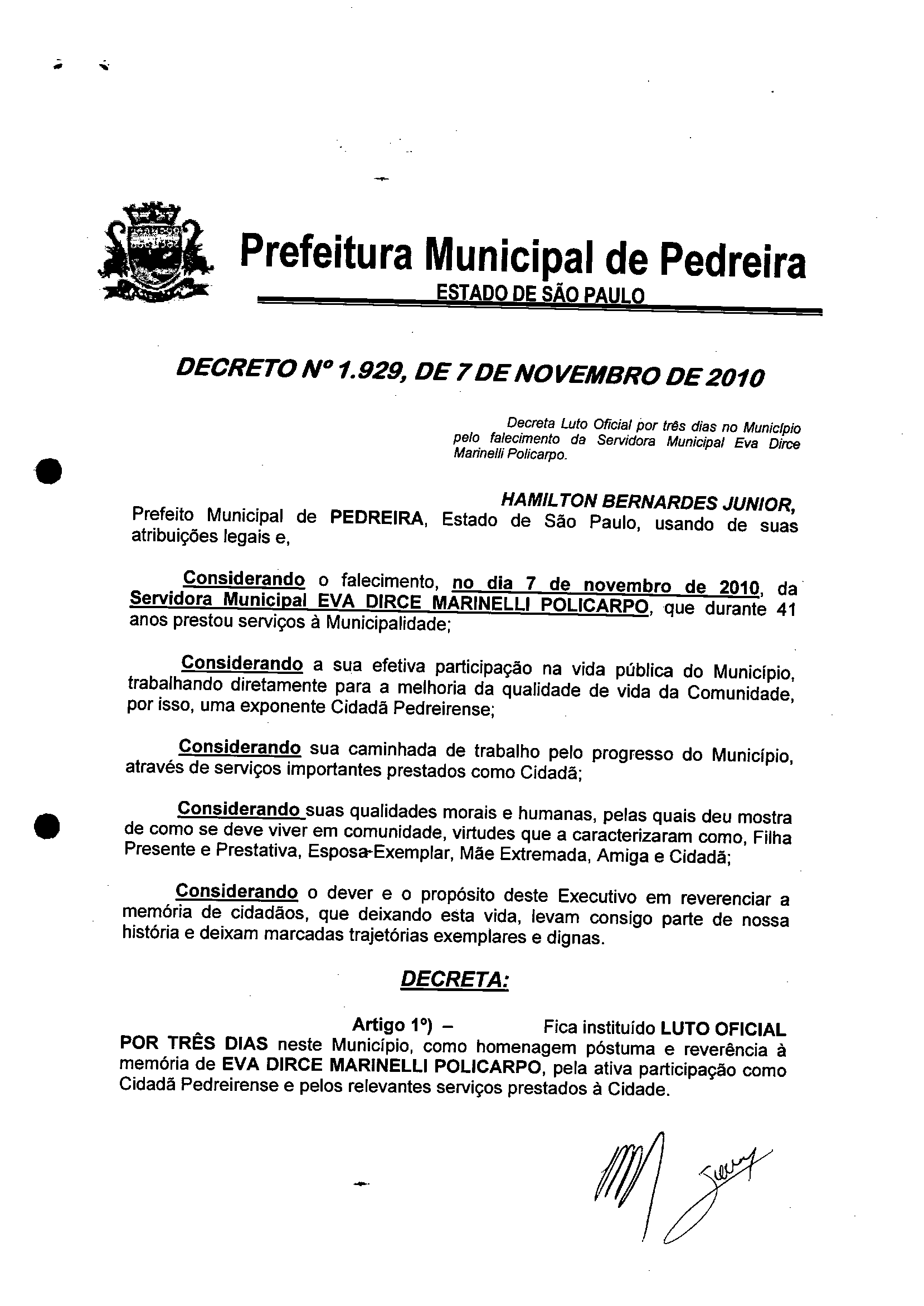 Ementa: Decreta Luto Oficial por tres dias no Municlpio pelo falecimento da Servidora Municipal Eva Dirce Marinelli Policarpo.