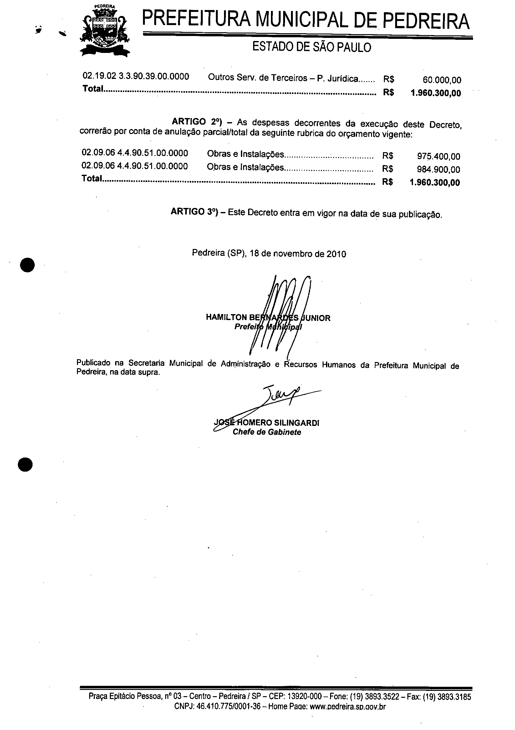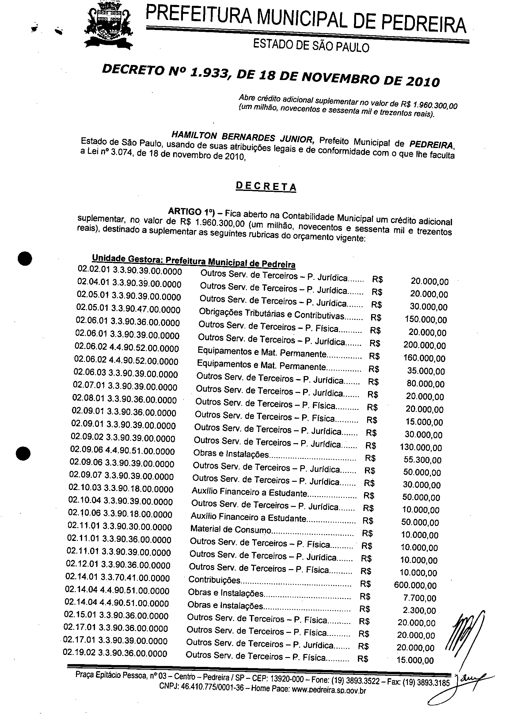 Ementa: Abre crédito adicional suplementar no valor de R$ 1.960.300,00 (um milhão, novecentos e sessenta mil e trezentos reais).