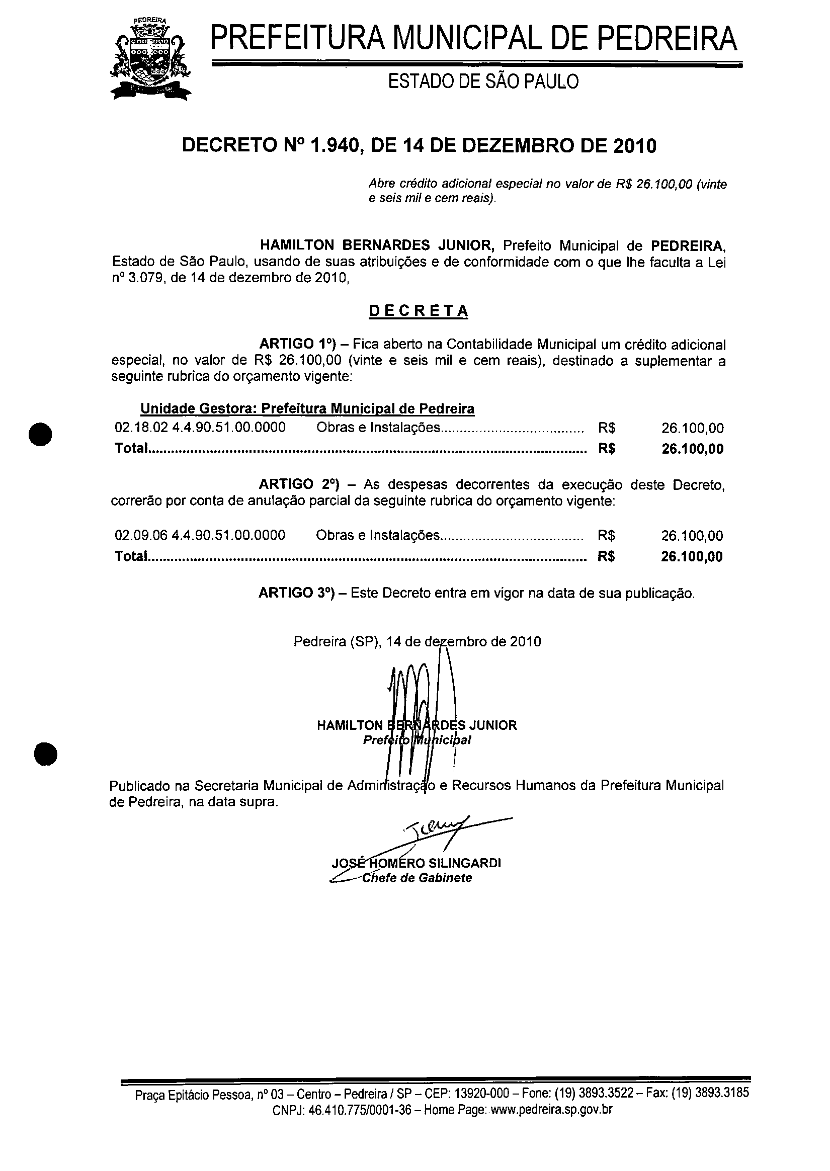 Ementa: Abre crédito adicional especial no valor de R$ 26.100,00 (vinte e seis mil e cem reais).