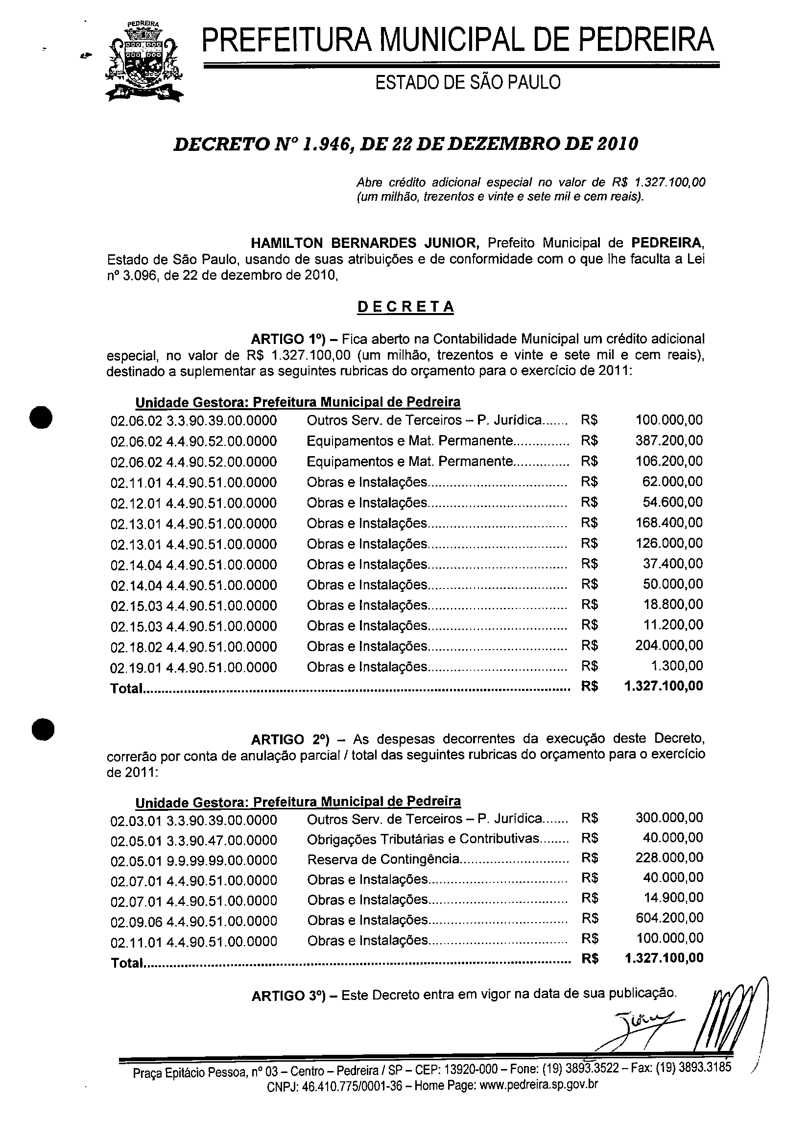 Ementa: Abre crédito adicional especial no valor de R$ 1.327.100,00 (um milhão, trezentos e vinte e sete mil e cem reais).