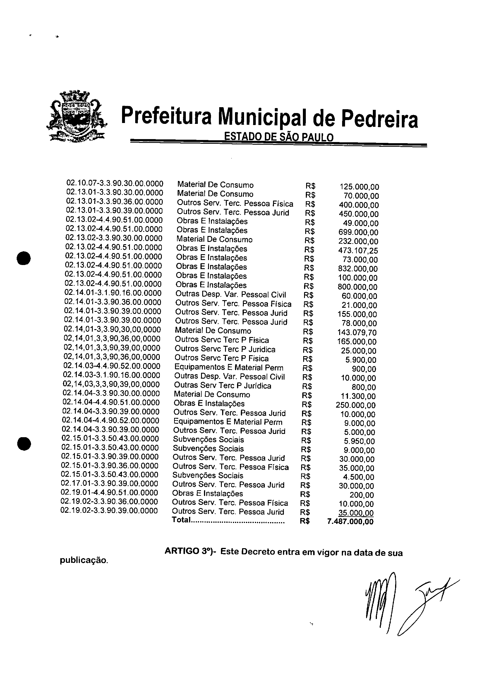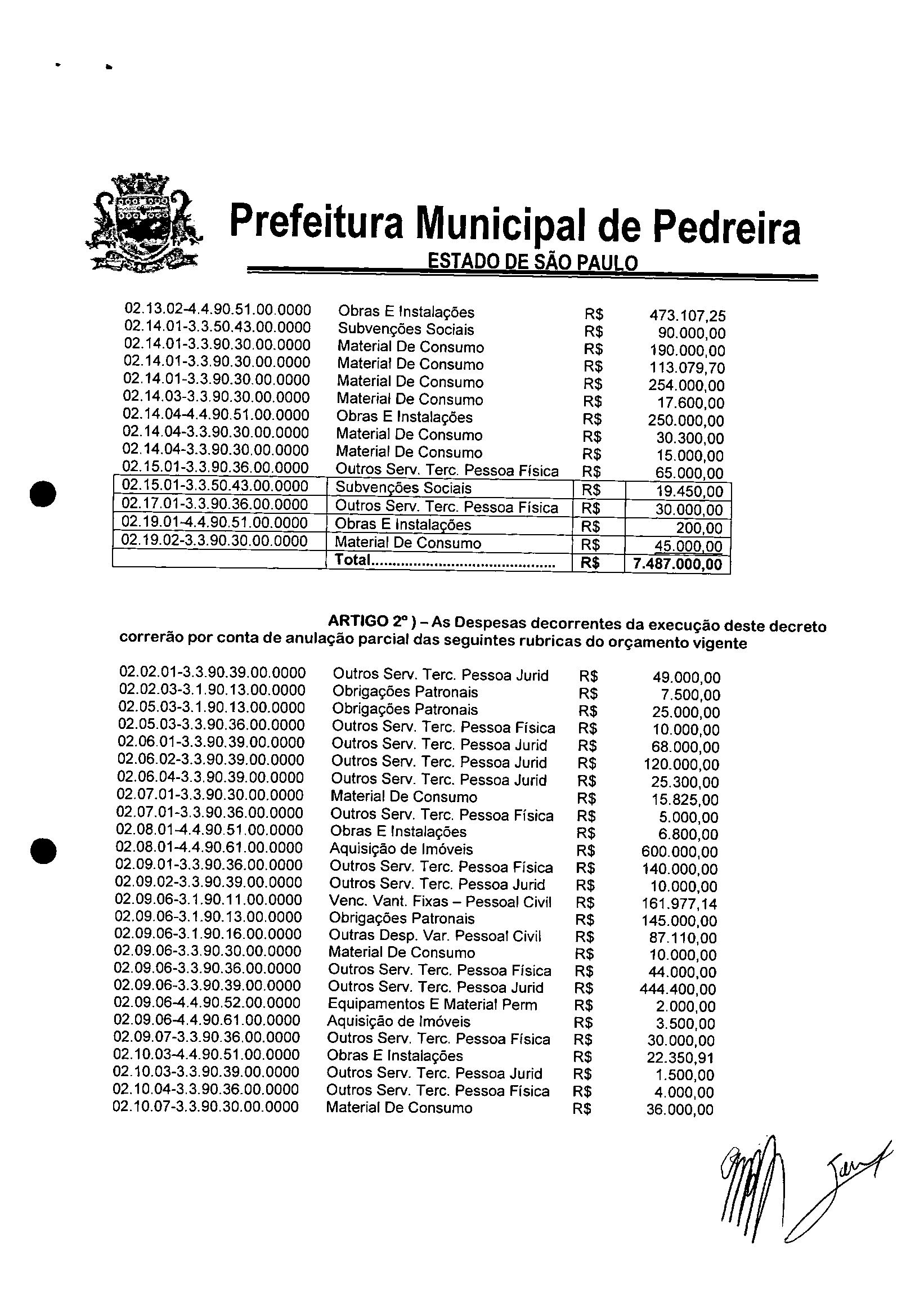 Ementa: Transposição e Remanejamento no valorR$ 7.487.000,00