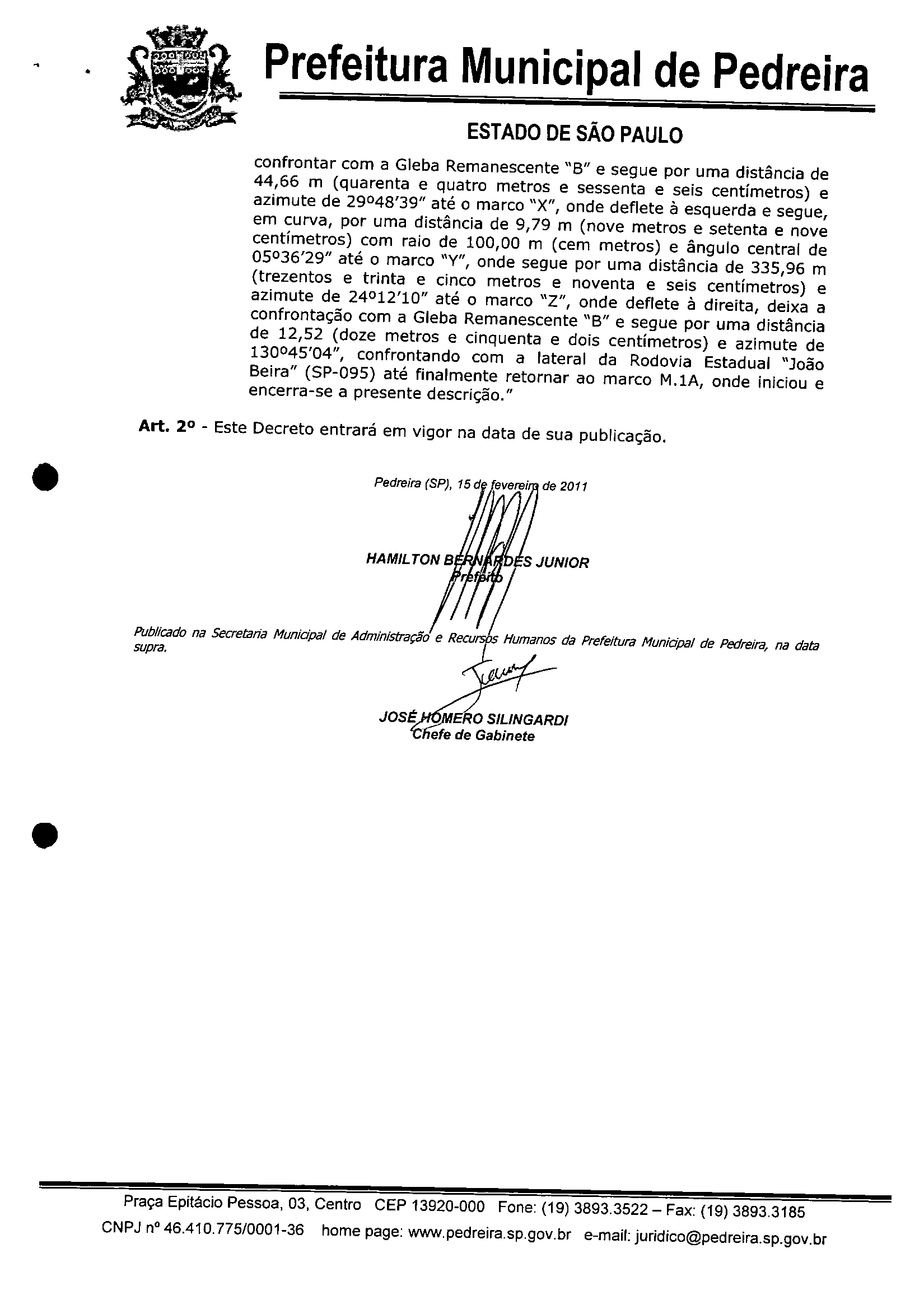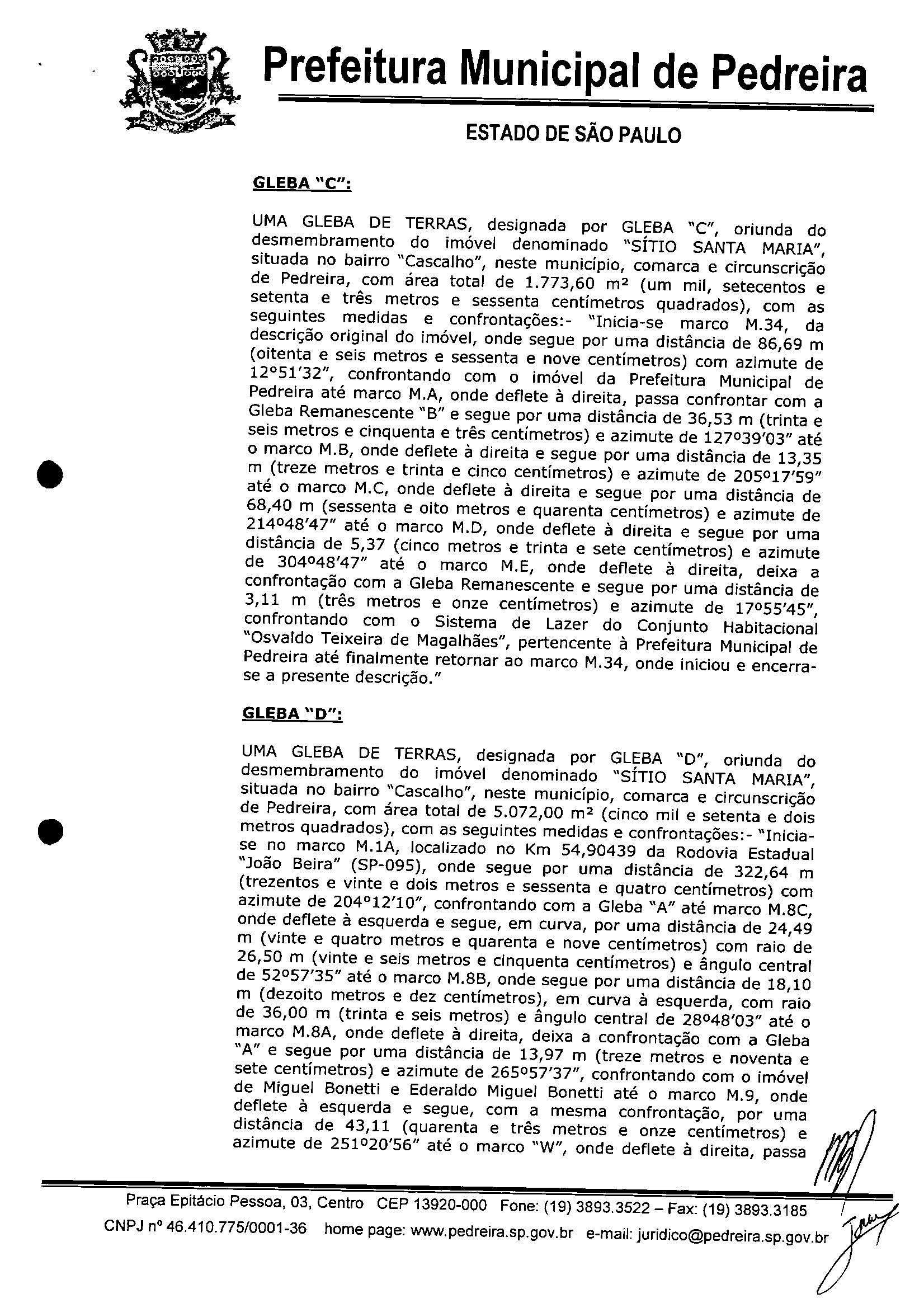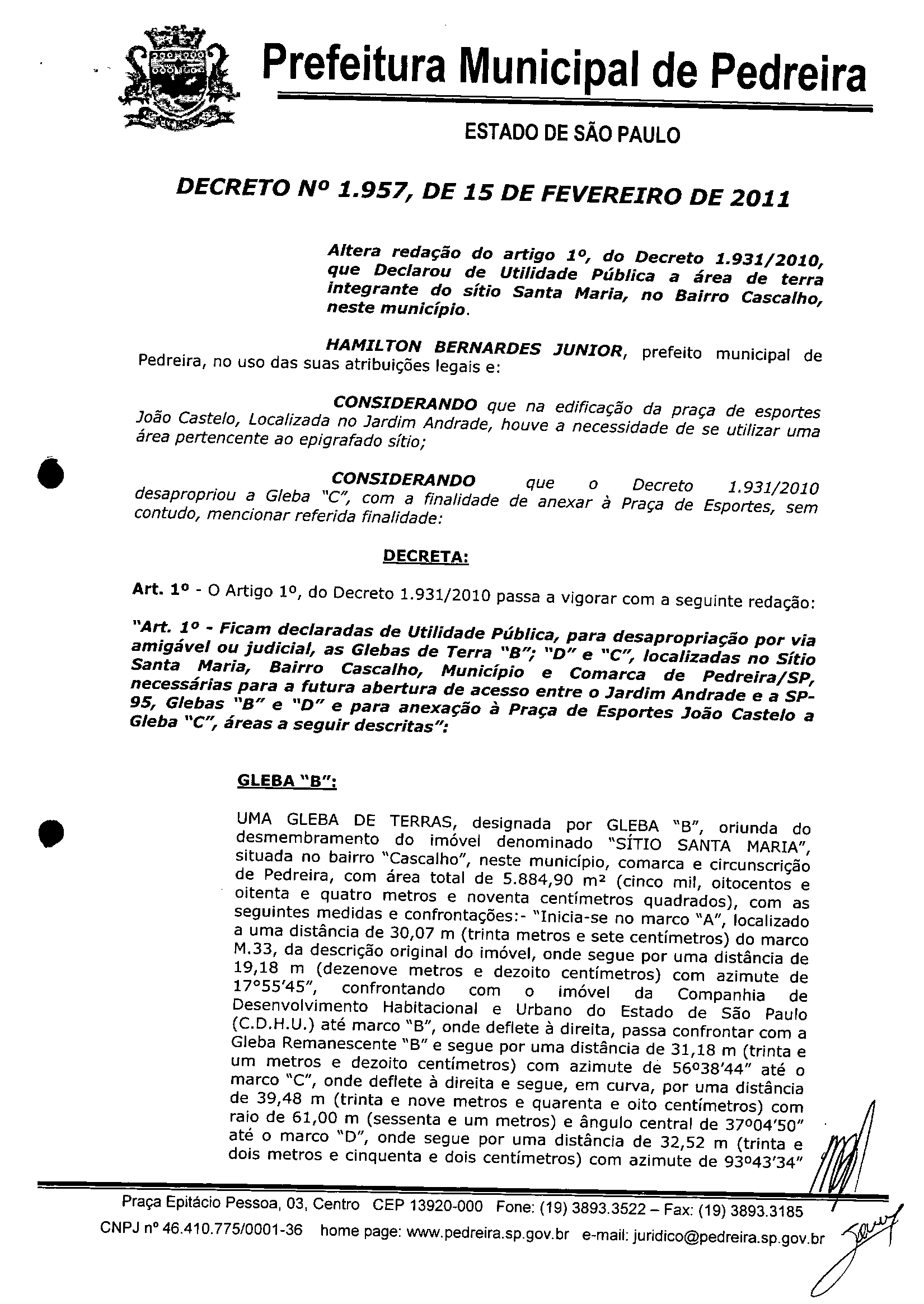 Ementa: Altera redação do artigo 1º, do Decreto 1.931/2010, que Declarou de Utilidade Pública a área de terra integrante do sítio Santa Maria, no Bairro Cascalho, neste município.