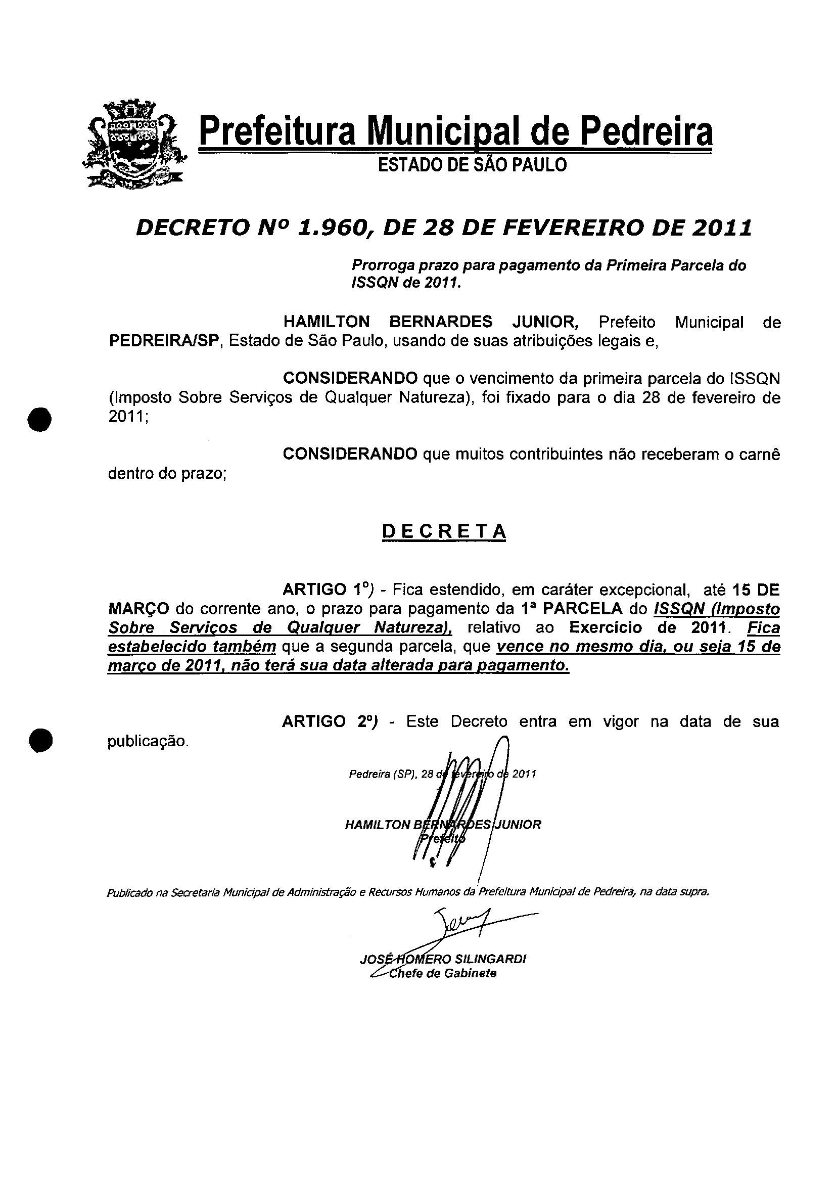 Ementa: Prorroga prazo para pagamento da Primeira Parcela do ISSQN de 2011.