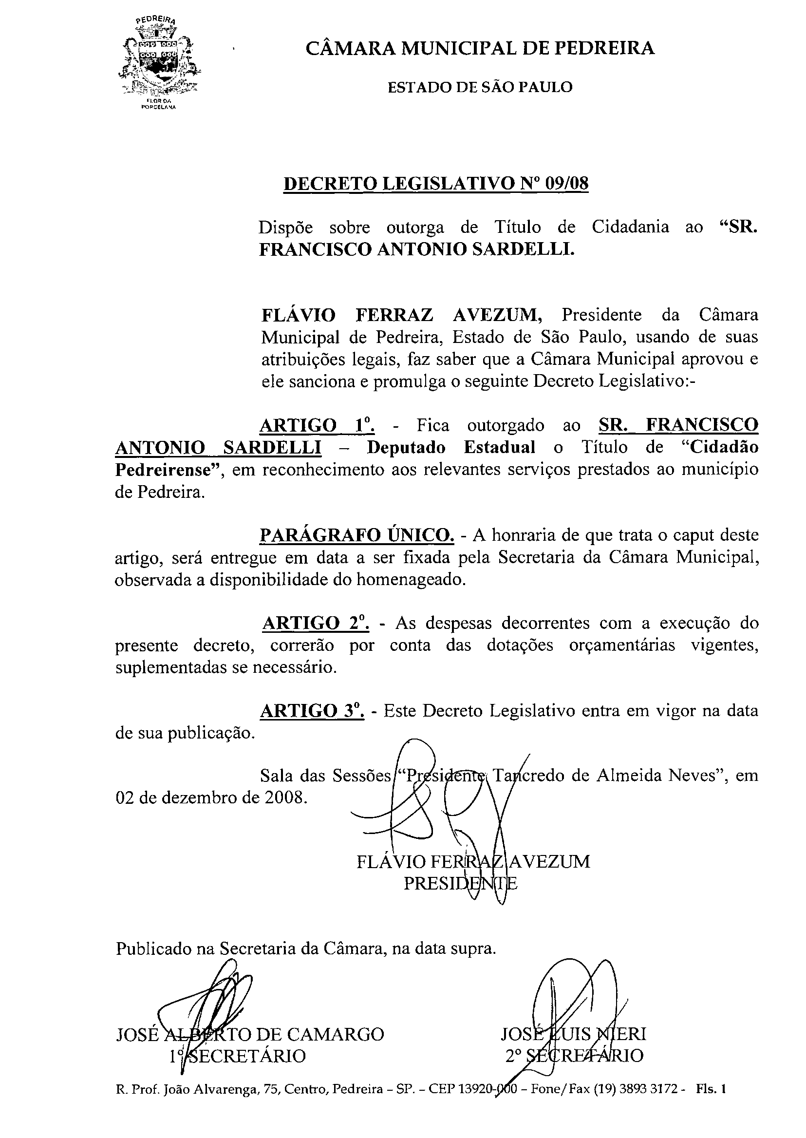 Ementa: Dispõe sobre outorga de Título de Cidadania ao "SR. FRANCISCO ANTONIO SARDELLI.