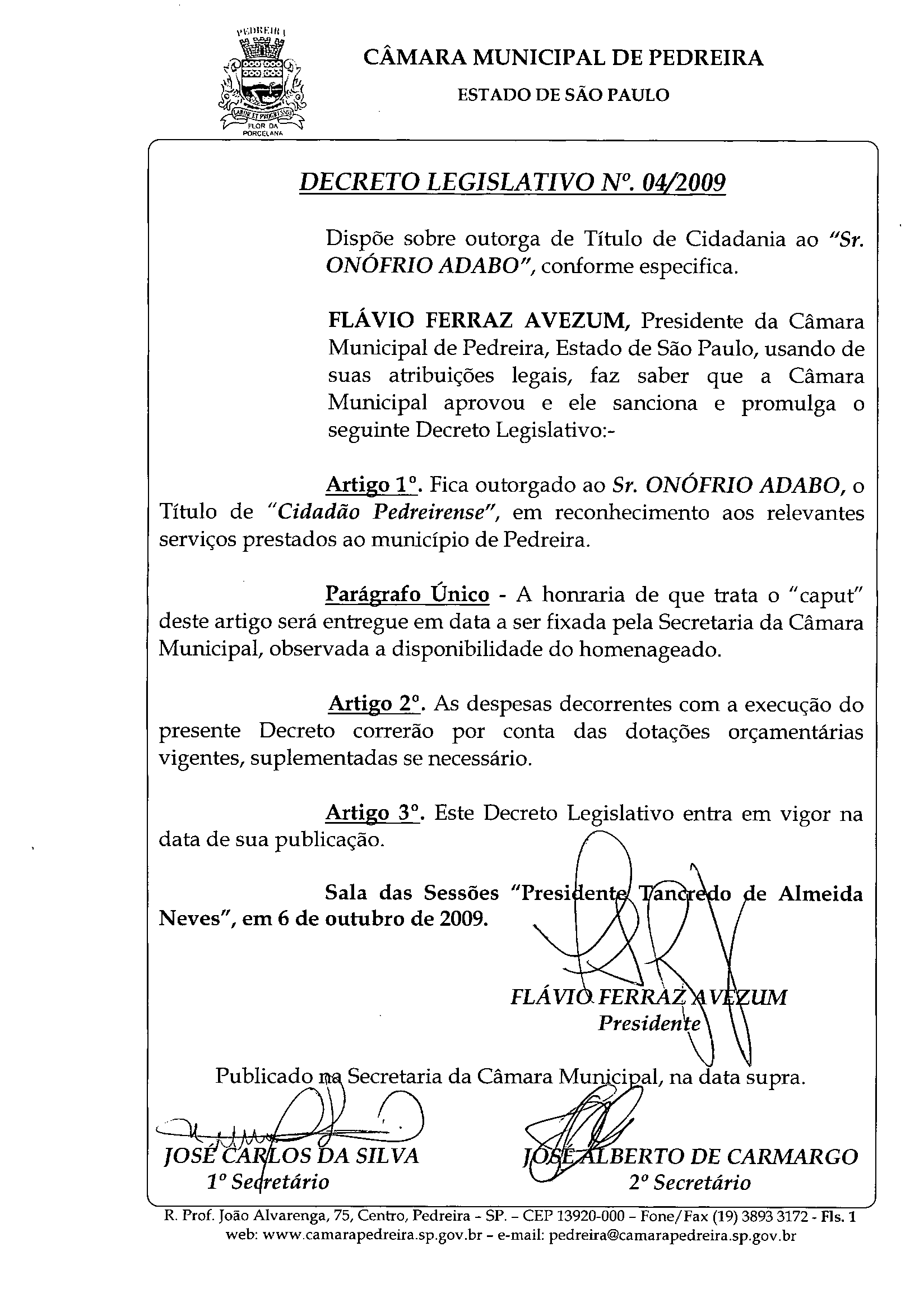 Ementa: Dispõe sobre outorga de Título de Cidadania ao "Sr. ONÓFRIO ADABO", conforme especifica.