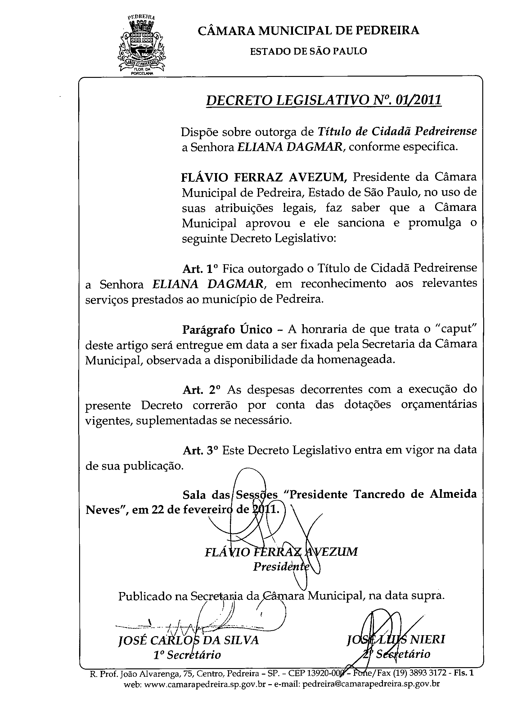 Ementa: Dispõe sobre outorga de Título de Cidadã Pedreirense a Senhora ELIANA DAGMAR, conforme especifica.
