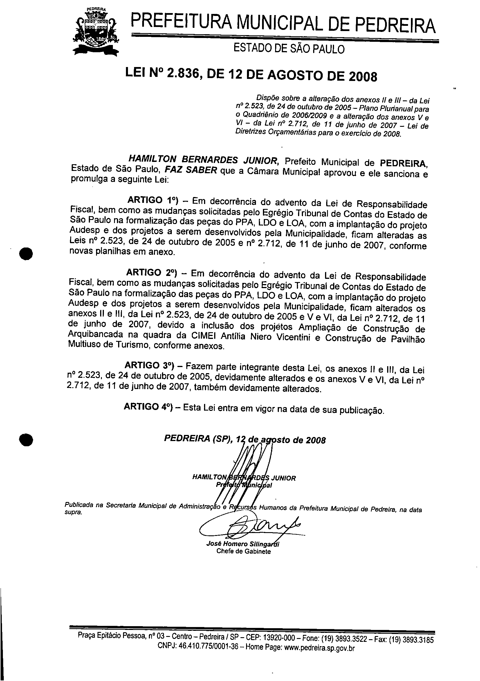 Ementa: Dispõe sobre a alteração dos anexos II e III - da Lei nº 2.523, de 24 de outubro de 2005-Plano Plurianual para o Quadriênio de 200612009 e a alteração dos anexos V e VI -da Lei nº 2.712, de 11 de junho de 2007 -Lei de Diretrizes Orçamentárias para o exercício de 2008.