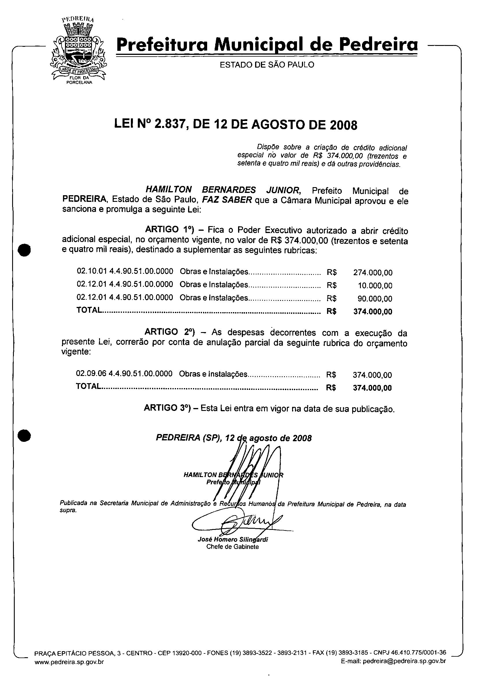 Lei Municipal - N° 2837 de 12/08/2008