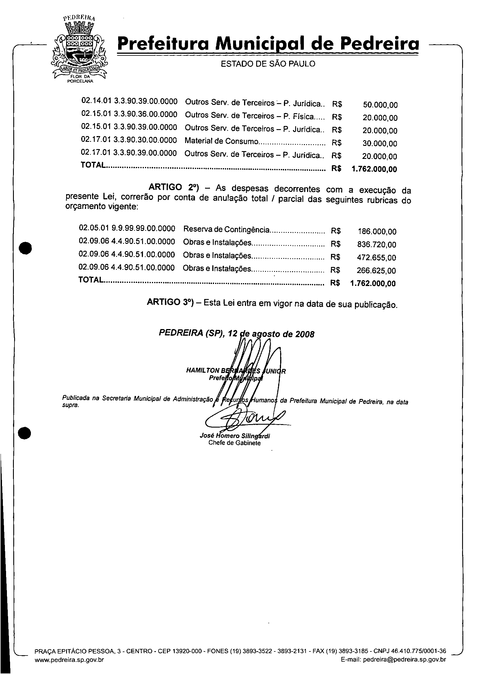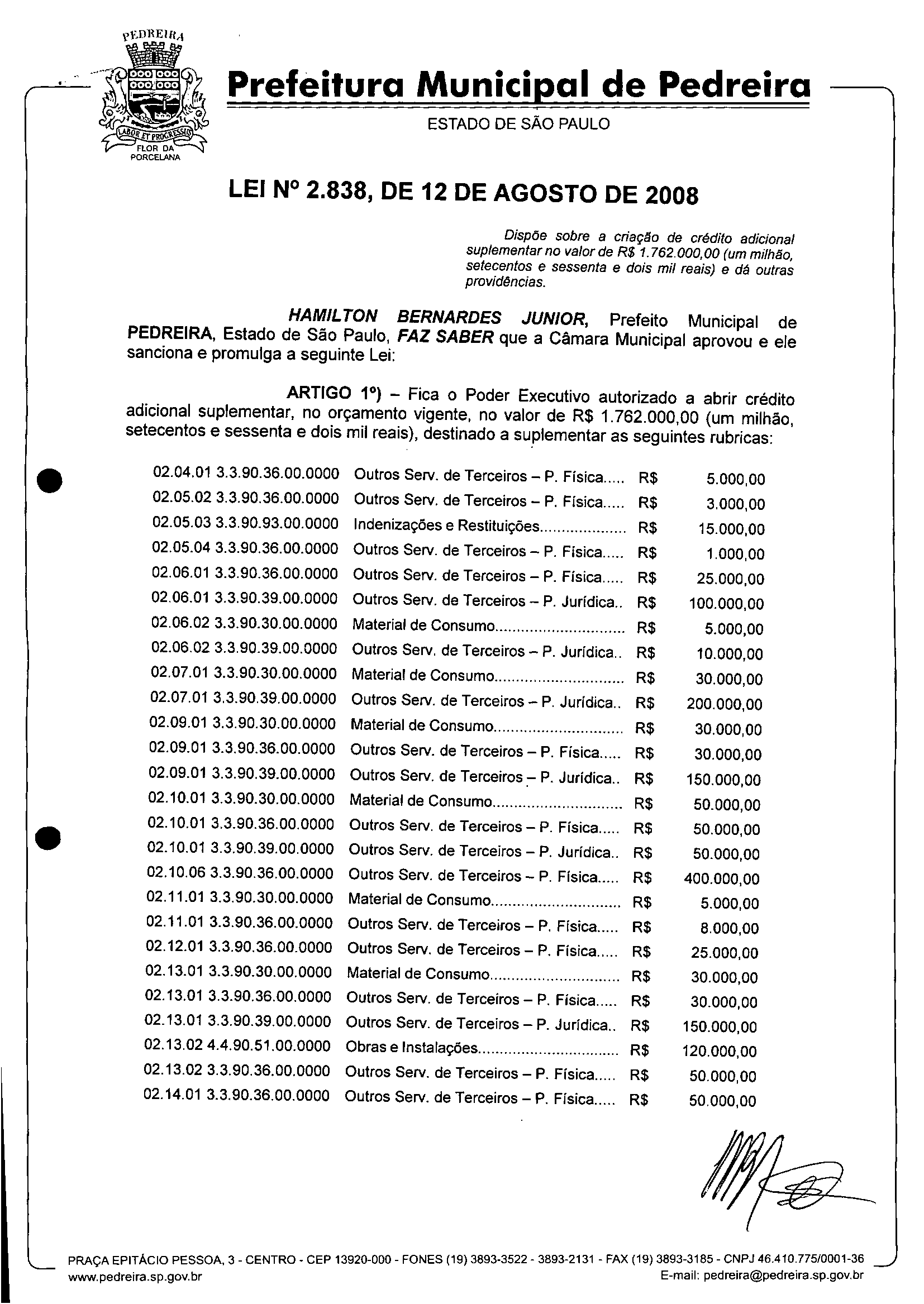 Ementa: Dispõe sobre a criação de crédito adicional suplementar no valor de R$ 1.762.000,00 (um milhão, setecentos e sessenta e dois mil reais) e da outras providencias.