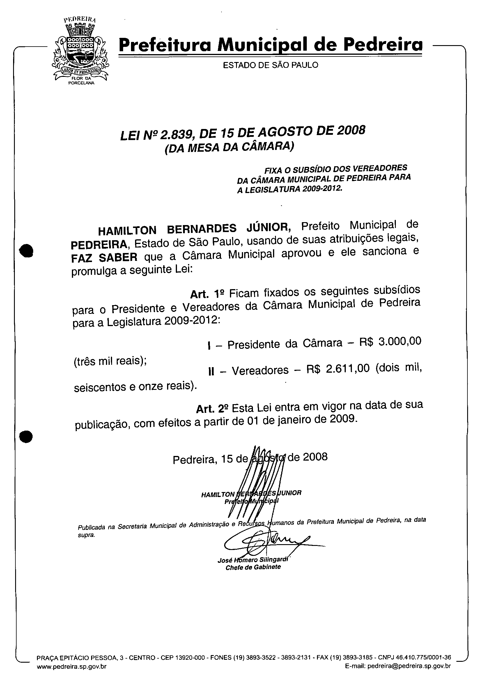 Ementa: FIXA O SUBSÍDIO DOS VEREADORES DA CÂMARA MUNICIPAL DE PEDREIRA PARA A LEGISLATURA 2009-2012.