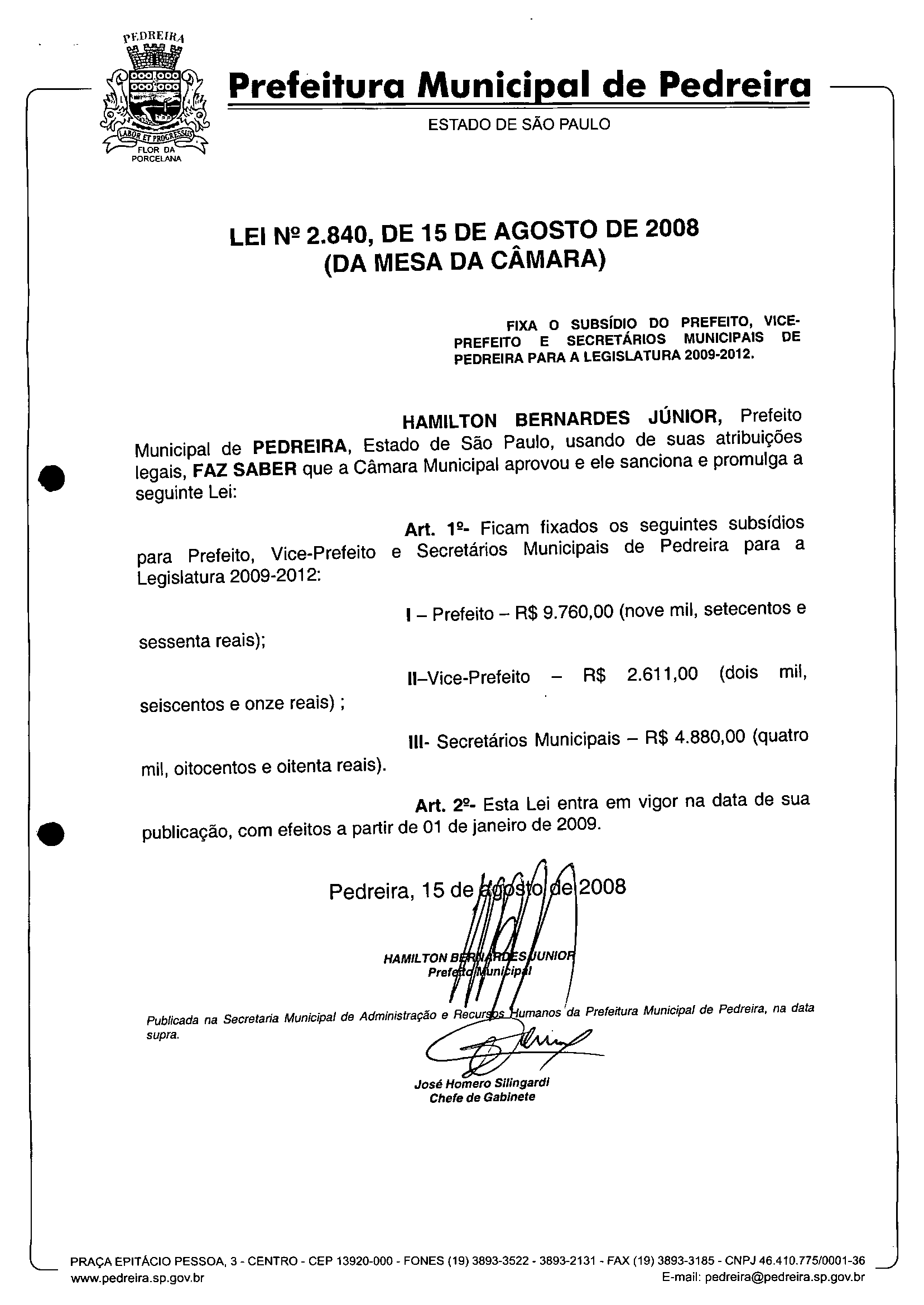 Ementa: FIXA O SUBSÍDIO DO PREFEITO, VICE-PREFEITO E SECRETÁRIOS MUNICIPAIS DE PEDREIRA PARA A LEGISLATURA 2009-2012.