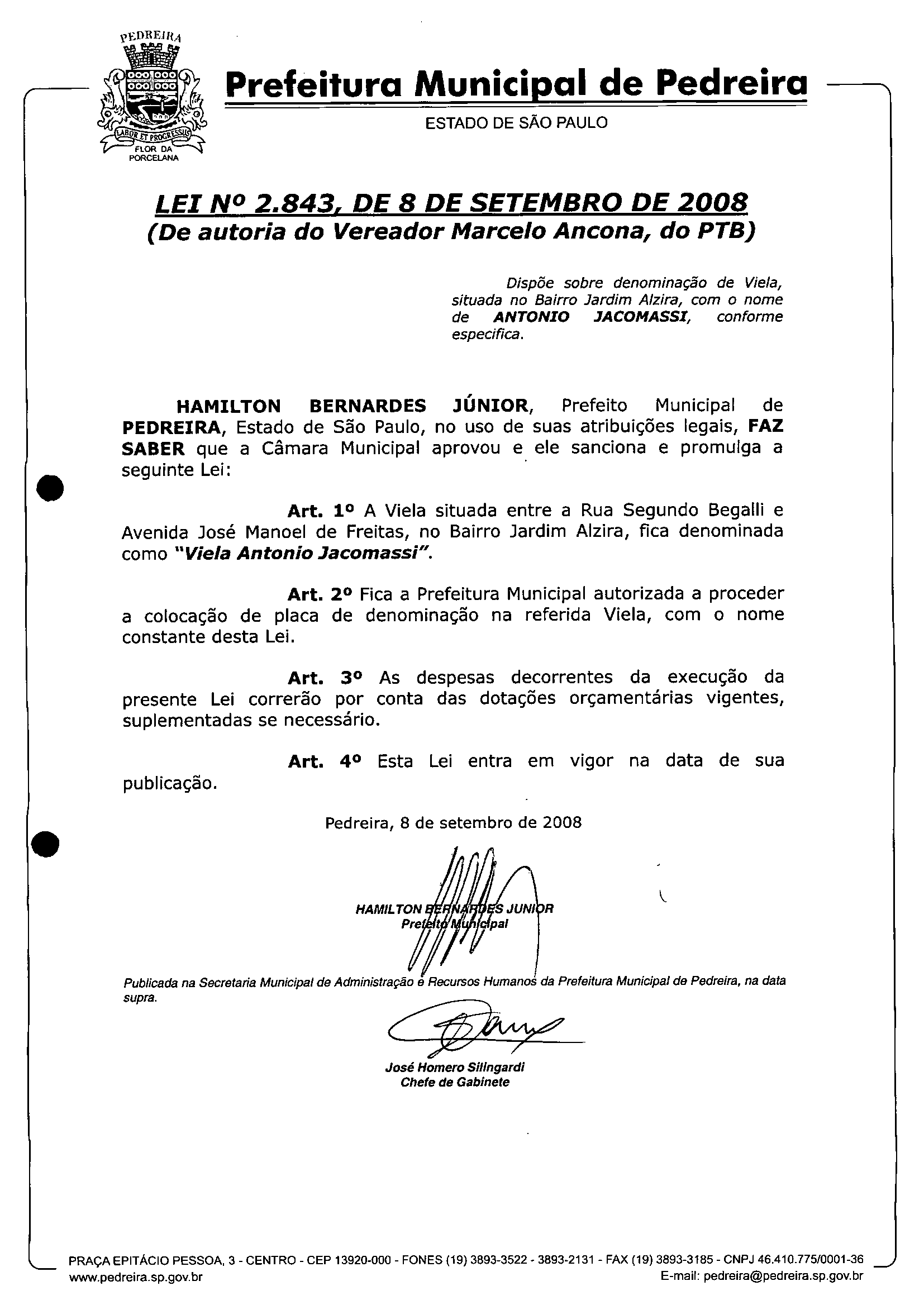 Ementa: Dispõe sobre denominação de Viela, situada no Bairro Jardim Alzira, com o nome de ANTONIO JACOMASSI, conforme especifica .