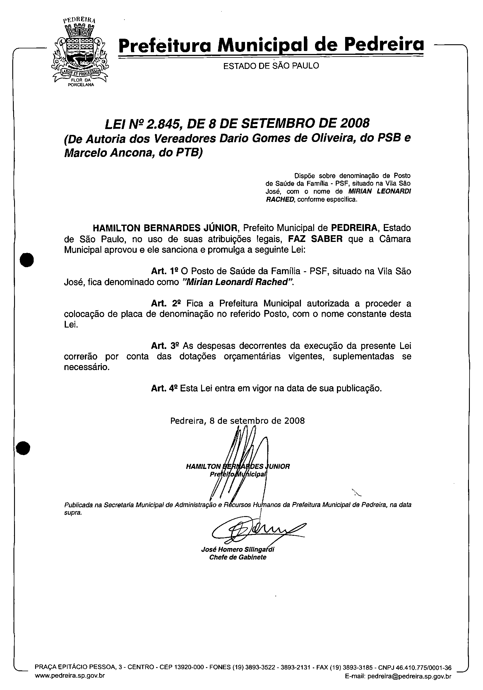 Ementa: Dispõe sobre denominação de Posto de Saúde da Família -PSF, situado na Vila São José, com o nome de MIRIAN LEONARDI RACHED, conforme especifica.