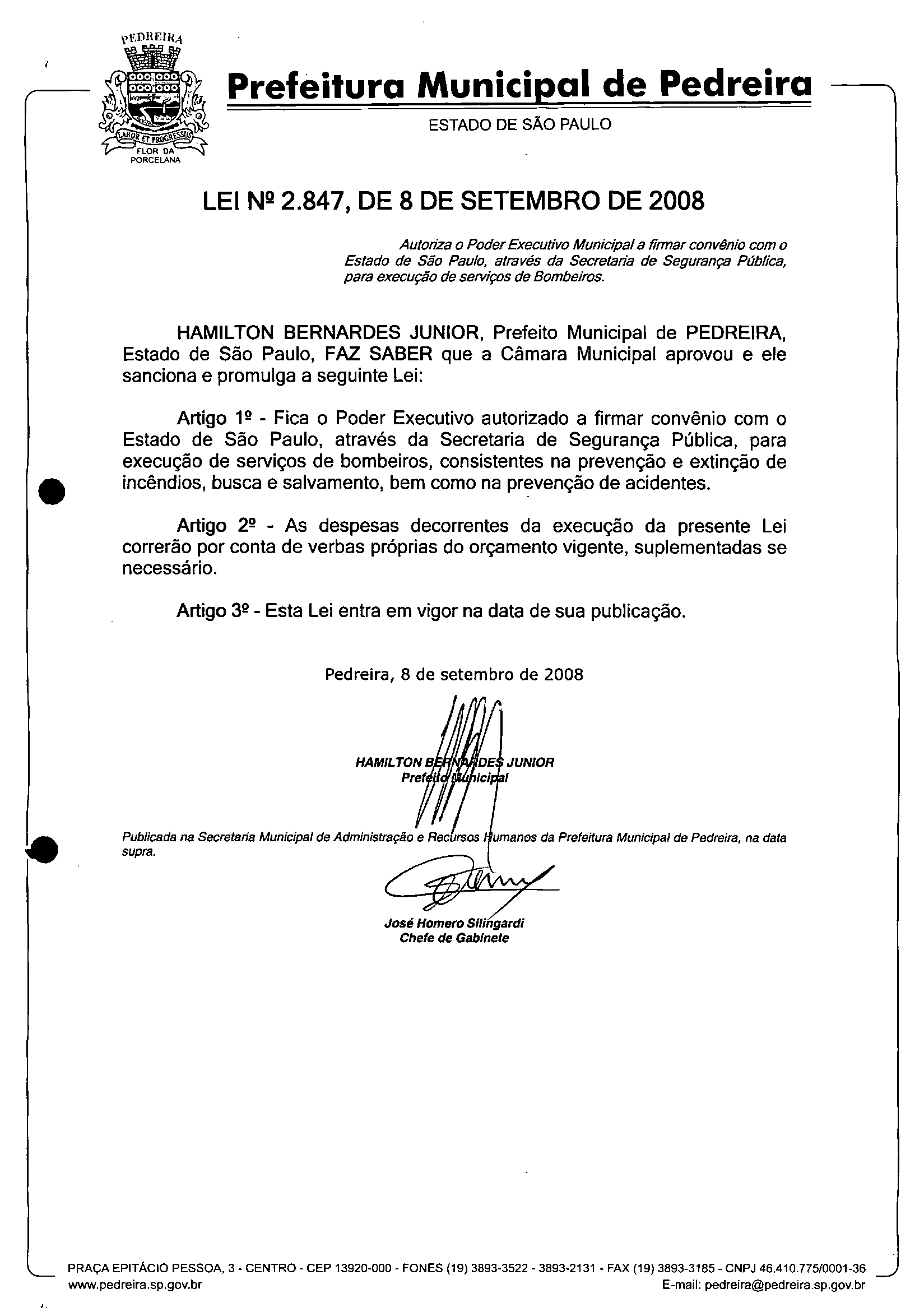 Lei Municipal - N° 2847 de 08/09/2008