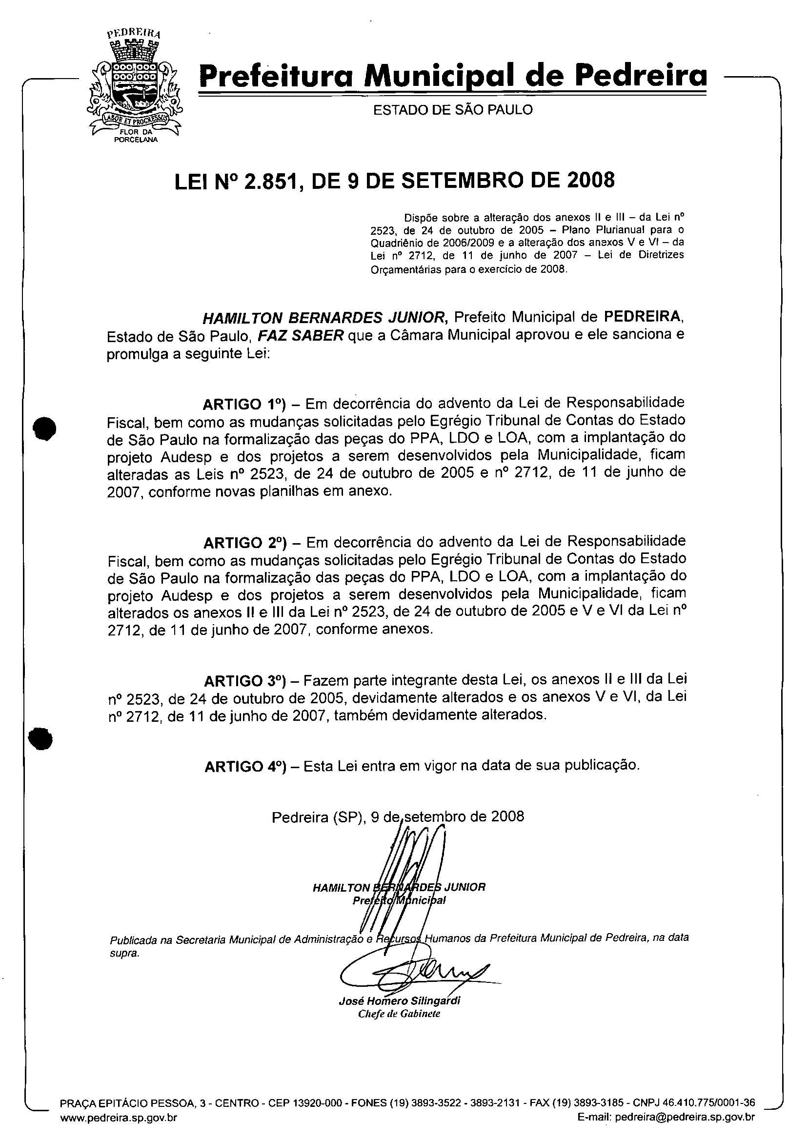 Lei Municipal - N° 2851 de 09/09/2008