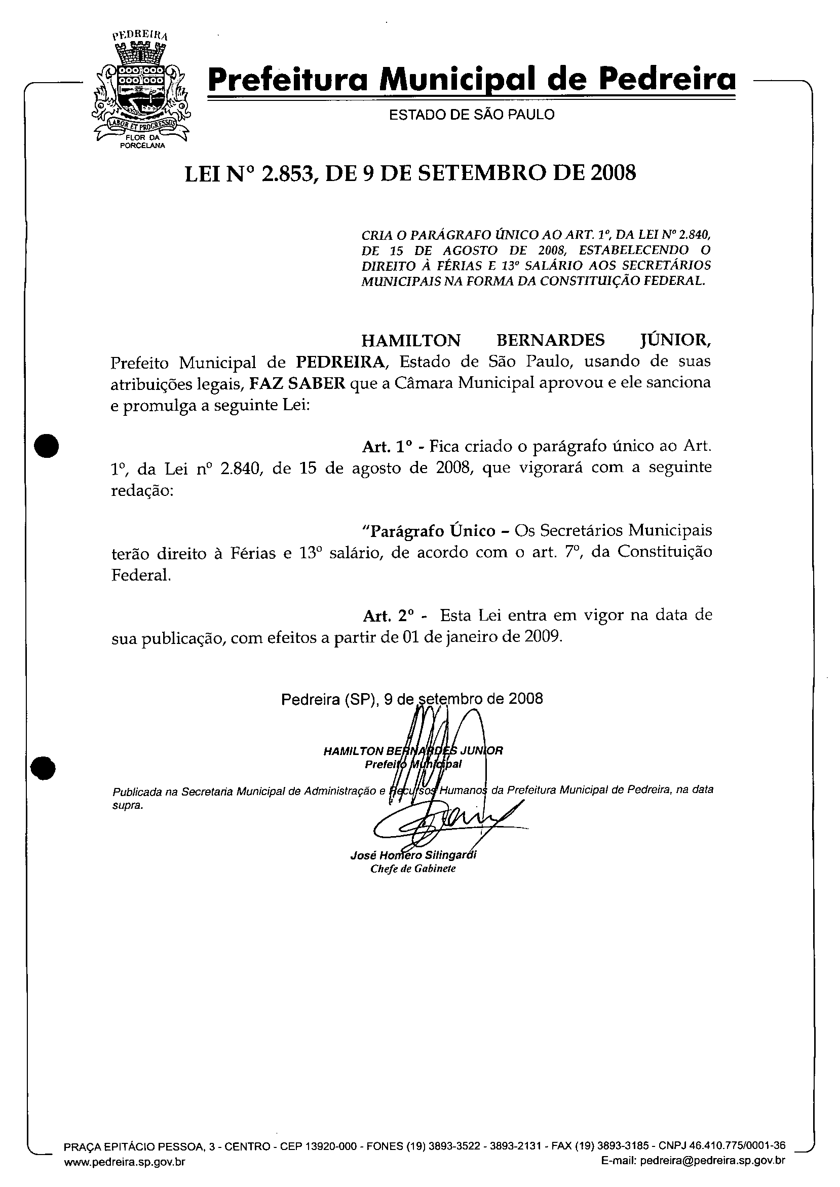 Ementa: CRIA O PARÁGRAFO ÚNICO AO ART. 1º, DA LEI Nº 2.840, DE 15 DE AGOSTO DE 2008, ESTABELECENDO O DIREITO À FÉRIAS E 13º SALÁRIO AOS SECRETÁRIOS MUNICIPAIS NA FORMA DA CONSTITUIÇÃO FEDERAL