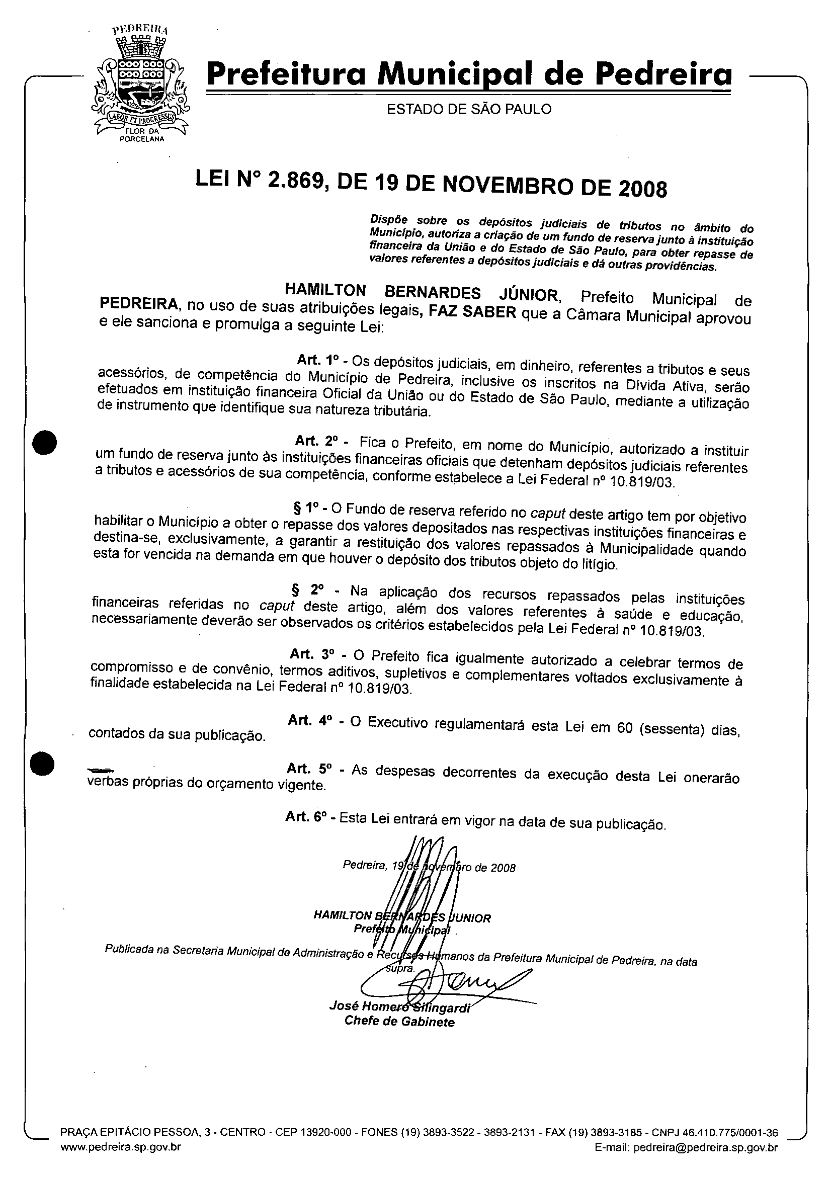 Lei Municipal - N° 2869 de 19/11/2008