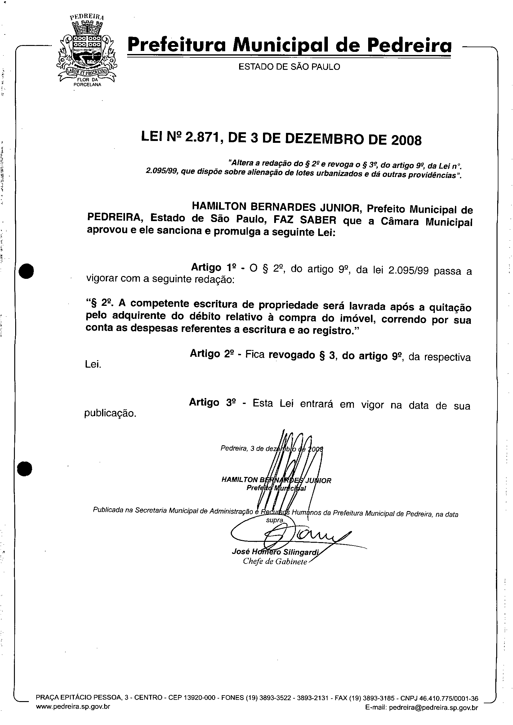 Lei Municipal - N° 2871 de 03/12/2008