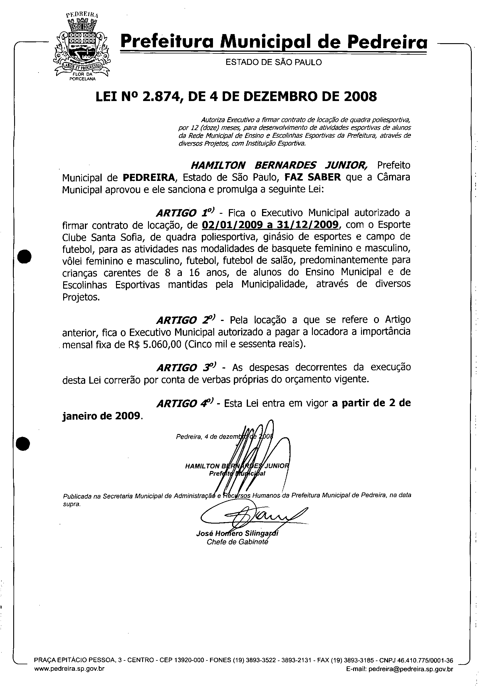 Lei Municipal - N° 2874 de 04/12/2008