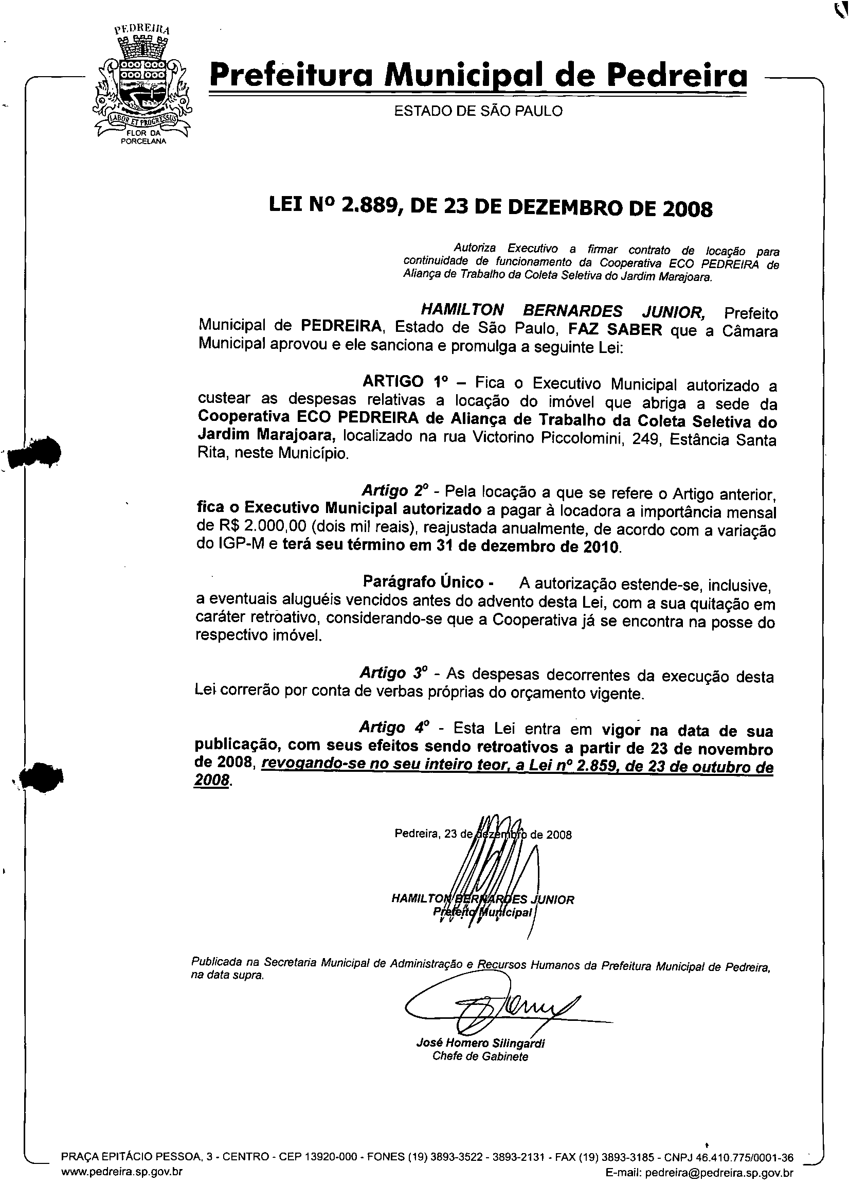 Ementa: Autoriza Executivo a firmar contrato de Jocaçlio para continuidade de funcionamento da Cooperativa ECO PEDREIRA de Aliança de Trabalho da Coleta Seletiva do Jardim Marajoara.