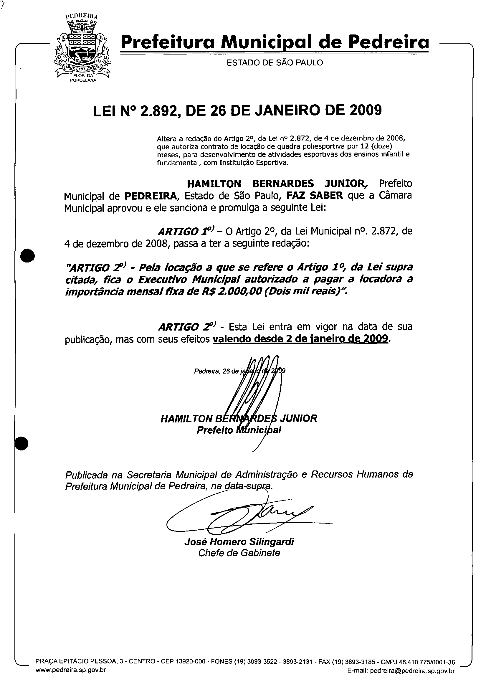 Lei Municipal - N° 2892 de 26/01/2009