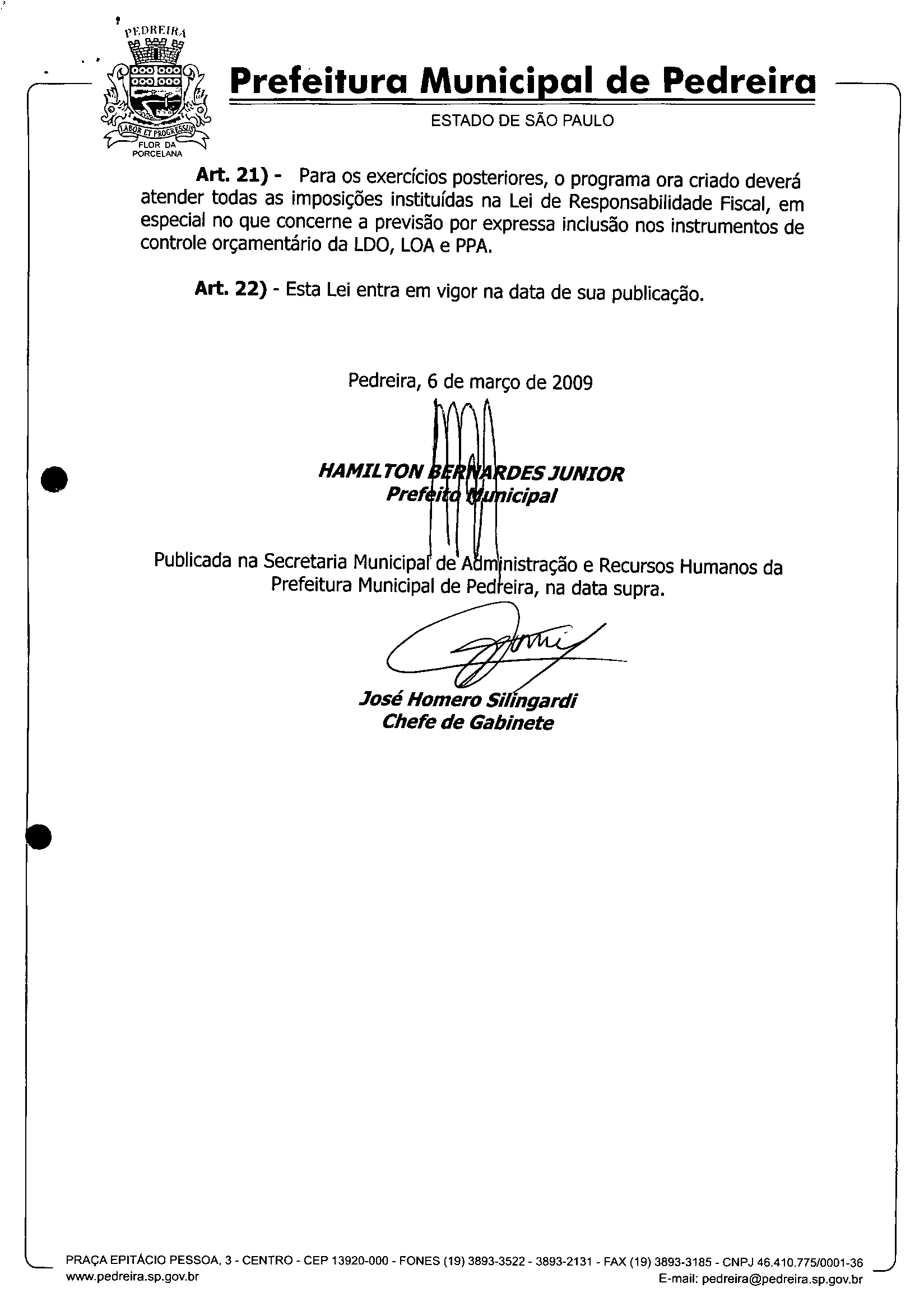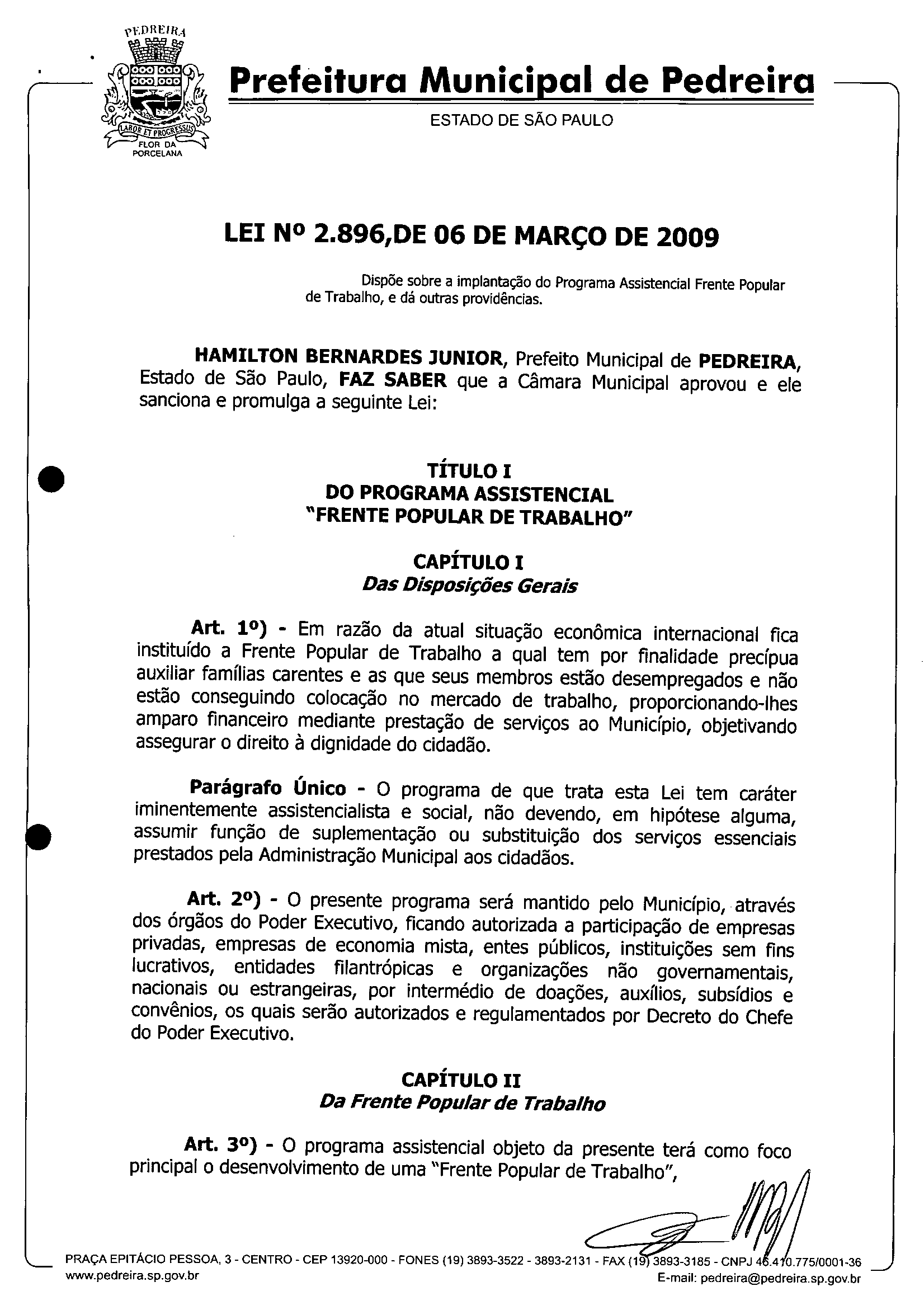 Lei Municipal - N° 2896 de 06/03/2009