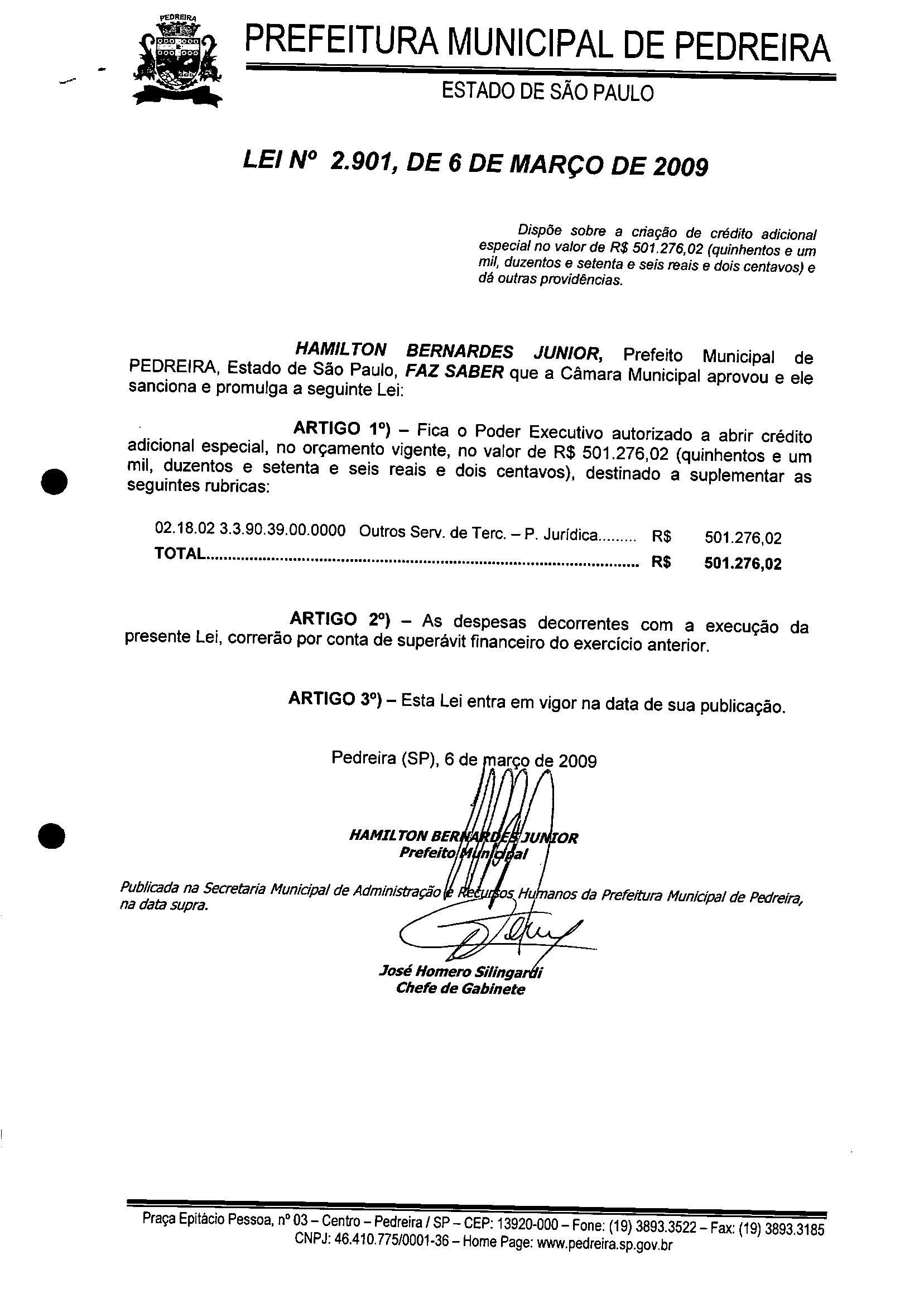 Ementa: Dispõe sobre a criação de crédito adicional especial no valor de R$ 501.276,02 (quinhentos e um mil, duzentos e setenta e seis reais e dois centavos) e dá outras providências.