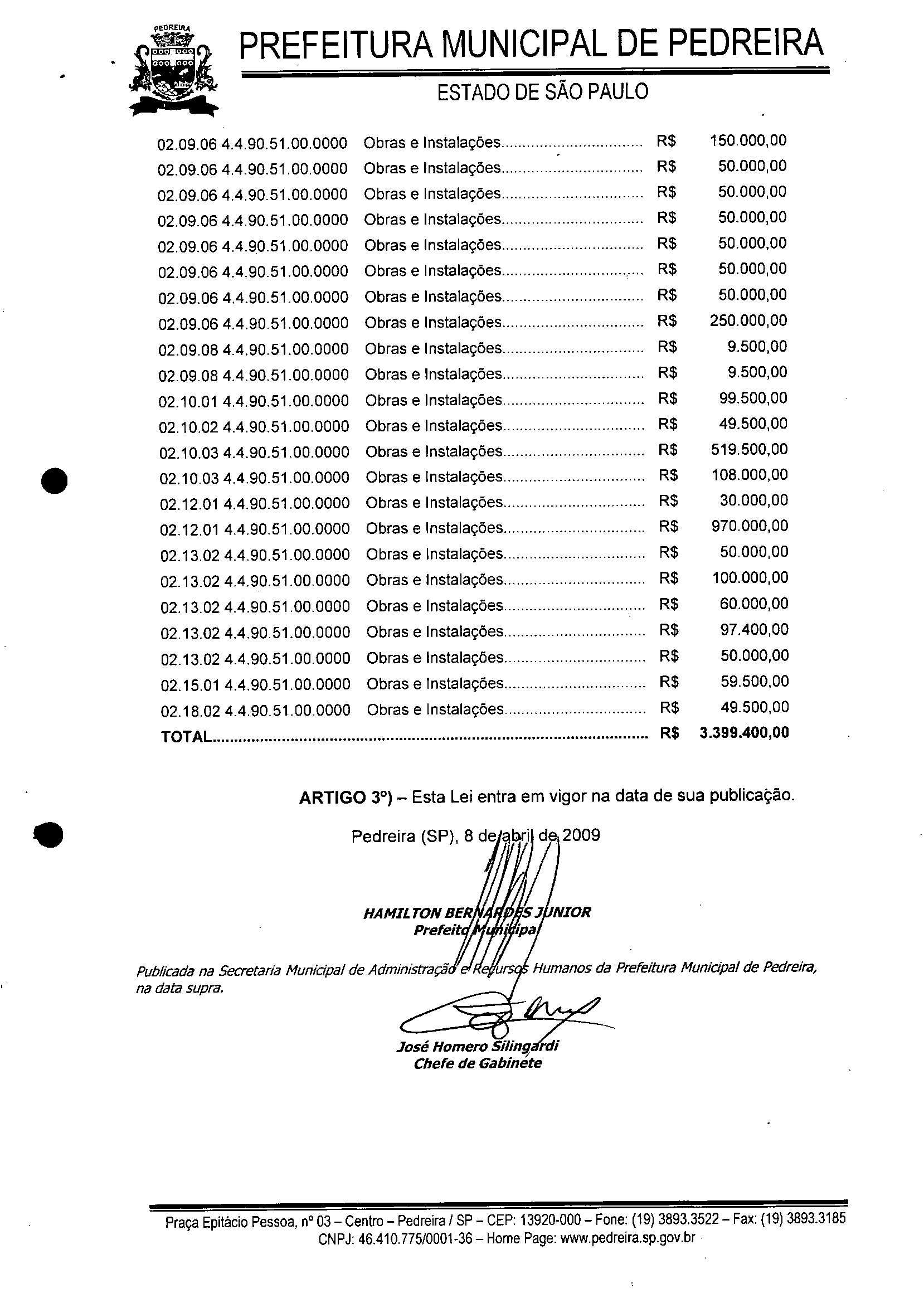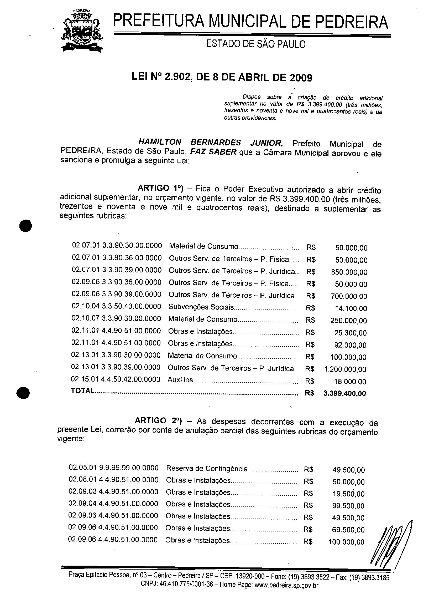 Ementa: Dispõe sobre a criação de crédito adicional suplementar no valor de R$ 3.399.400,00 (três milhões, trezentos e noventa e nove mil e quatrocentos reais) e dá outras providências.