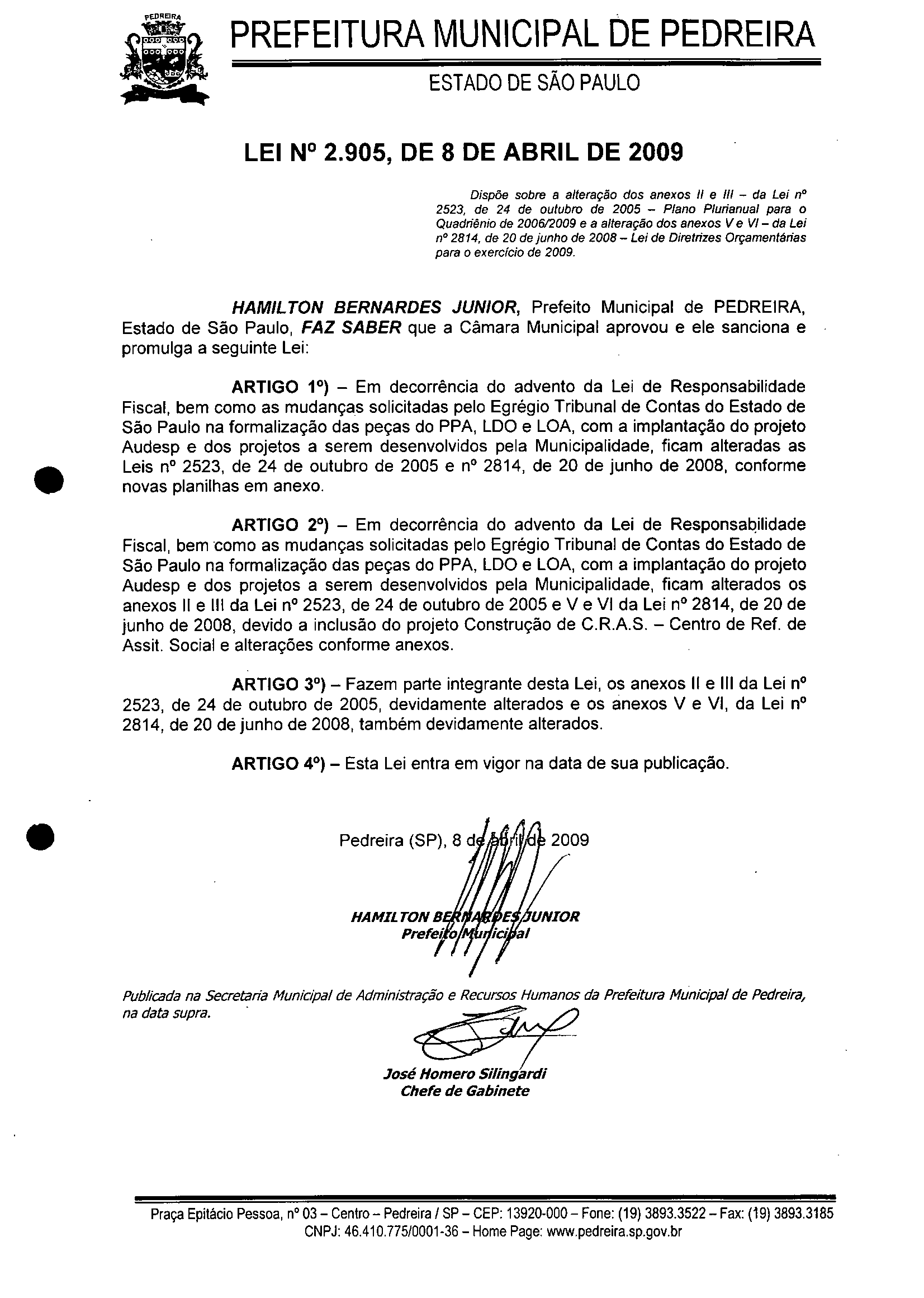 Lei Municipal - N° 2905 de 08/04/2009